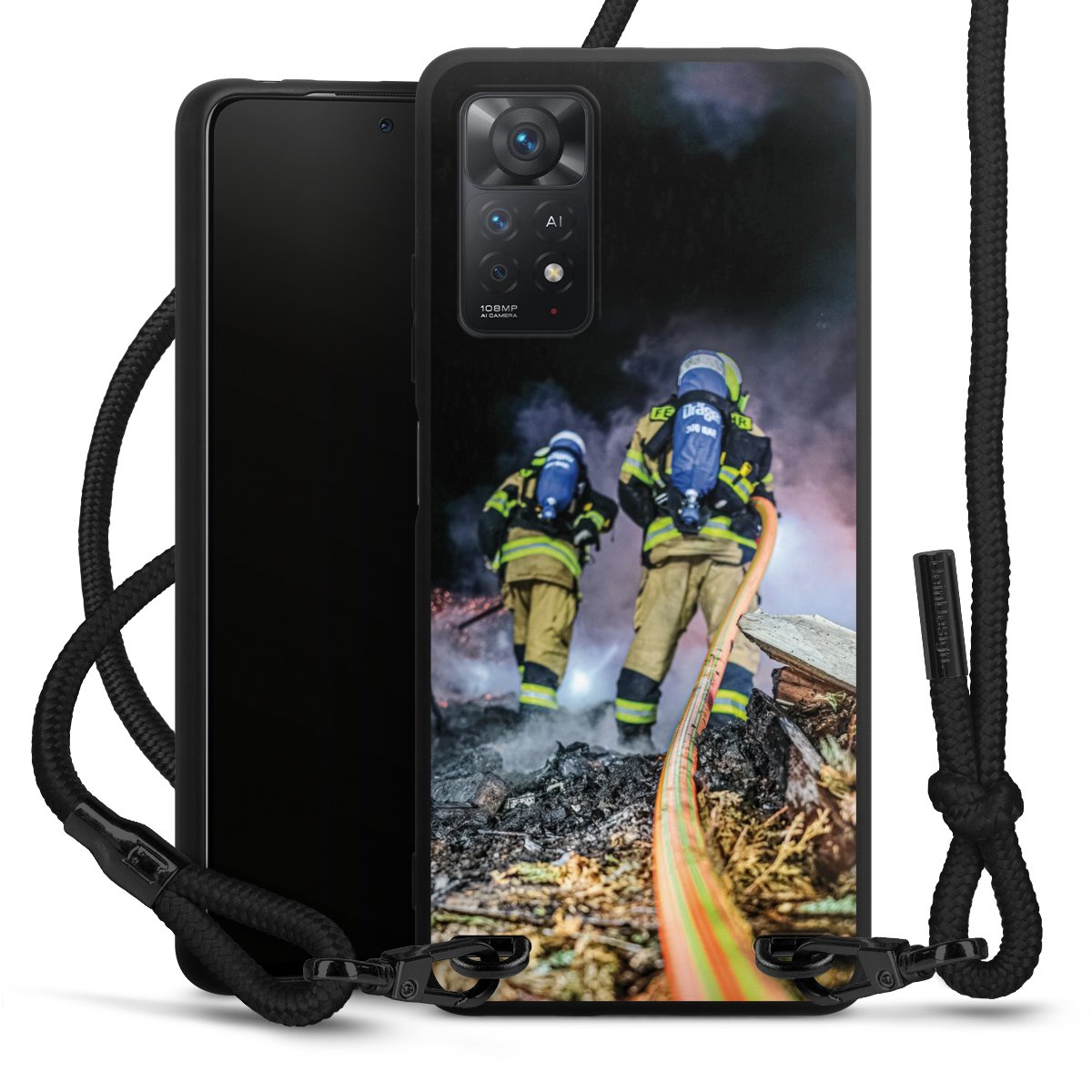 The matt black silicone case is made of flexible TPU (thermoplastic polyurethane) and offers robust protection. The durable, unbreakable material makes the cover flexible and dimensionally stable at the same time. The matte surface makes your design stand out more and is less susceptible to fingerprints and dirt. The stylish trend accessory fits comfortably in the hand and is perfectly complemented by the fabric (polyester) mobile phone strap. The braided fabric strap is approx. 1.70 metres long with a diameter of approx. 0.5 cm. Due to the special knotting technique, the length of the strap can be adjusted by simply pulling it, so that you can adapt it individually to your wishes. The practical case to wear around your neck is available with the fabric strap in black. As a little icing on the cake, we have provided the strap with a chic metal fastener in matt black. The strap is securely fastened to the case with loops made of high-quality genuine leather and press studs. The ends of the fabric strap are covered with metallic end caps and thus protected from fraying.