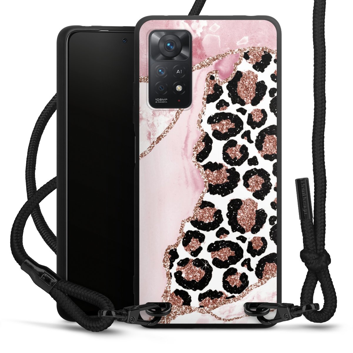 The matt black silicone case is made of flexible TPU (thermoplastic polyurethane) and offers robust protection. The durable, unbreakable material makes the cover flexible and dimensionally stable at the same time. The matte surface makes your design stand out more and is less susceptible to fingerprints and dirt. The stylish trend accessory fits comfortably in the hand and is perfectly complemented by the fabric (polyester) mobile phone strap. The braided fabric strap is approx. 1.70 metres long with a diameter of approx. 0.5 cm. Due to the special knotting technique, the length of the strap can be adjusted by simply pulling it, so that you can adapt it individually to your wishes. The practical case to wear around your neck is available with the fabric strap in black. As a little icing on the cake, we have provided the strap with a chic metal fastener in matt black. The strap is securely fastened to the case with loops made of high-quality genuine leather and press studs. The ends of the fabric strap are covered with metallic end caps and thus protected from fraying.