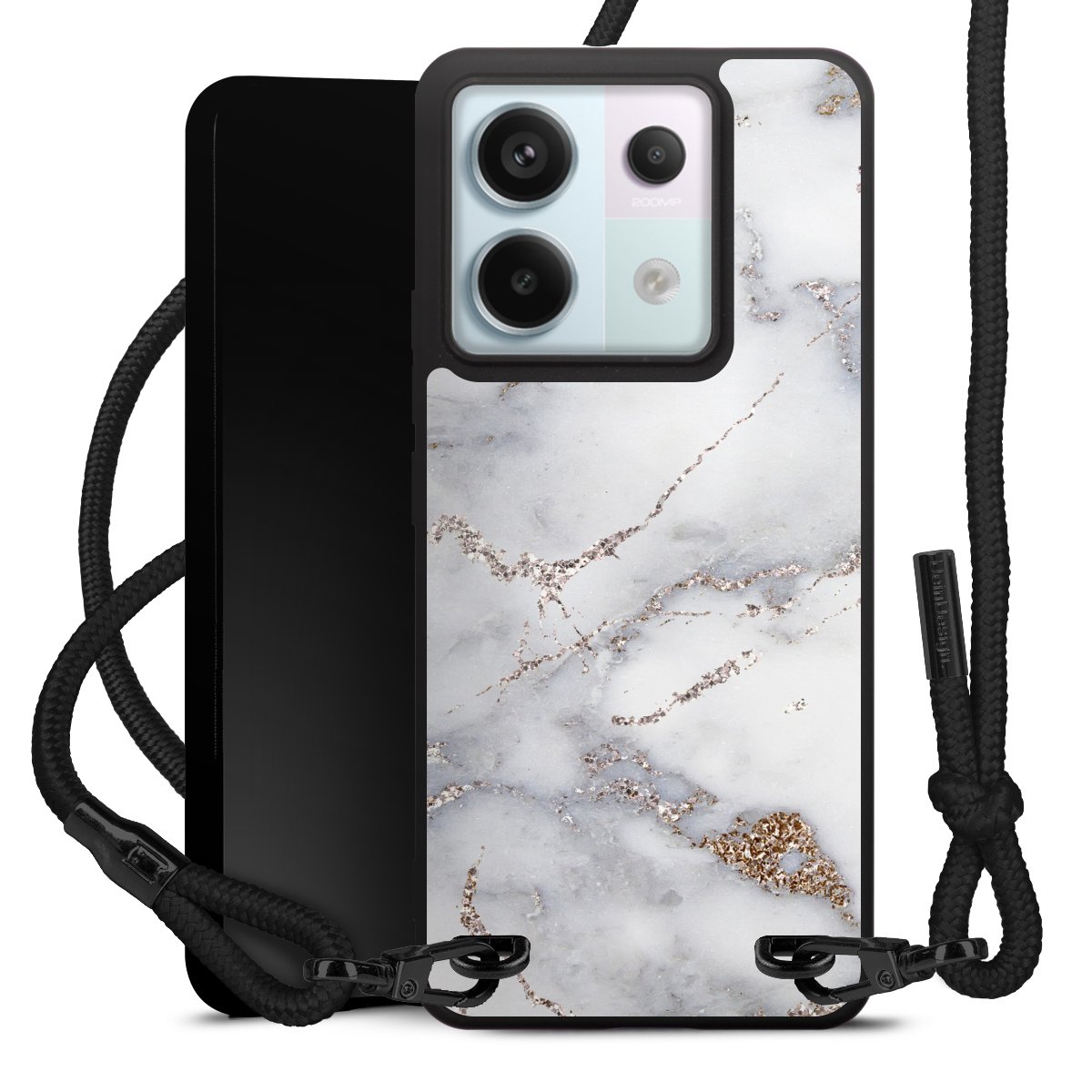 The matt black silicone case is made of flexible TPU (thermoplastic polyurethane) and offers robust protection. The durable, unbreakable material makes the cover flexible and dimensionally stable at the same time. The matte surface makes your design stand out more and is less susceptible to fingerprints and dirt. The stylish trend accessory fits comfortably in the hand and is perfectly complemented by the fabric (polyester) mobile phone strap. The braided fabric strap is approx. 1.70 metres long with a diameter of approx. 0.5 cm. Due to the special knotting technique, the length of the strap can be adjusted by simply pulling it, so that you can adapt it individually to your wishes. The practical case to wear around your neck is available with the fabric strap in black. As a little icing on the cake, we have provided the strap with a chic metal fastener in matt black. The strap is securely fastened to the case with loops made of high-quality genuine leather and press studs. The ends of the fabric strap are covered with metallic end caps and thus protected from fraying.