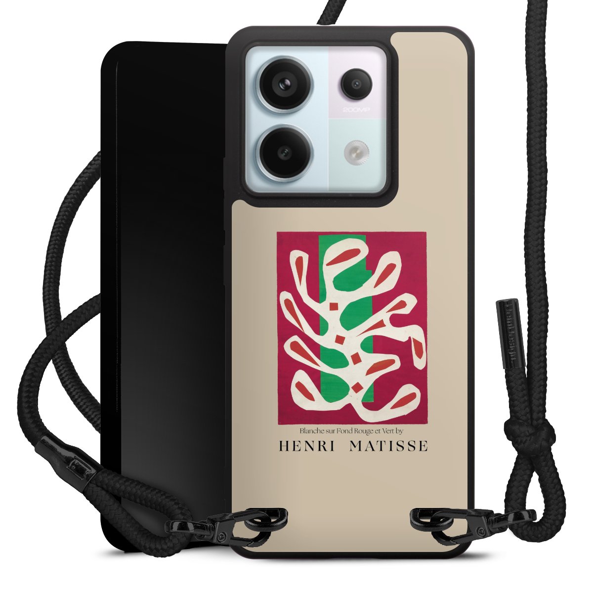 The matt black silicone case is made of flexible TPU (thermoplastic polyurethane) and offers robust protection. The durable, unbreakable material makes the cover flexible and dimensionally stable at the same time. The matte surface makes your design stand out more and is less susceptible to fingerprints and dirt. The stylish trend accessory fits comfortably in the hand and is perfectly complemented by the fabric (polyester) mobile phone strap. The braided fabric strap is approx. 1.70 metres long with a diameter of approx. 0.5 cm. Due to the special knotting technique, the length of the strap can be adjusted by simply pulling it, so that you can adapt it individually to your wishes. The practical case to wear around your neck is available with the fabric strap in black. As a little icing on the cake, we have provided the strap with a chic metal fastener in matt black. The strap is securely fastened to the case with loops made of high-quality genuine leather and press studs. The ends of the fabric strap are covered with metallic end caps and thus protected from fraying.