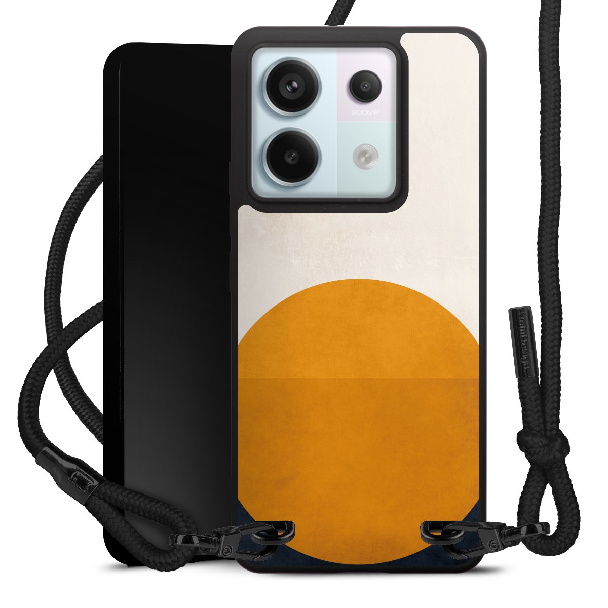 The matt black silicone case is made of flexible TPU (thermoplastic polyurethane) and offers robust protection. The durable, unbreakable material makes the cover flexible and dimensionally stable at the same time. The matte surface makes your design stand out more and is less susceptible to fingerprints and dirt. The stylish trend accessory fits comfortably in the hand and is perfectly complemented by the fabric (polyester) mobile phone strap. The braided fabric strap is approx. 1.70 metres long with a diameter of approx. 0.5 cm. Due to the special knotting technique, the length of the strap can be adjusted by simply pulling it, so that you can adapt it individually to your wishes. The practical case to wear around your neck is available with the fabric strap in black. As a little icing on the cake, we have provided the strap with a chic metal fastener in matt black. The strap is securely fastened to the case with loops made of high-quality genuine leather and press studs. The ends of the fabric strap are covered with metallic end caps and thus protected from fraying.