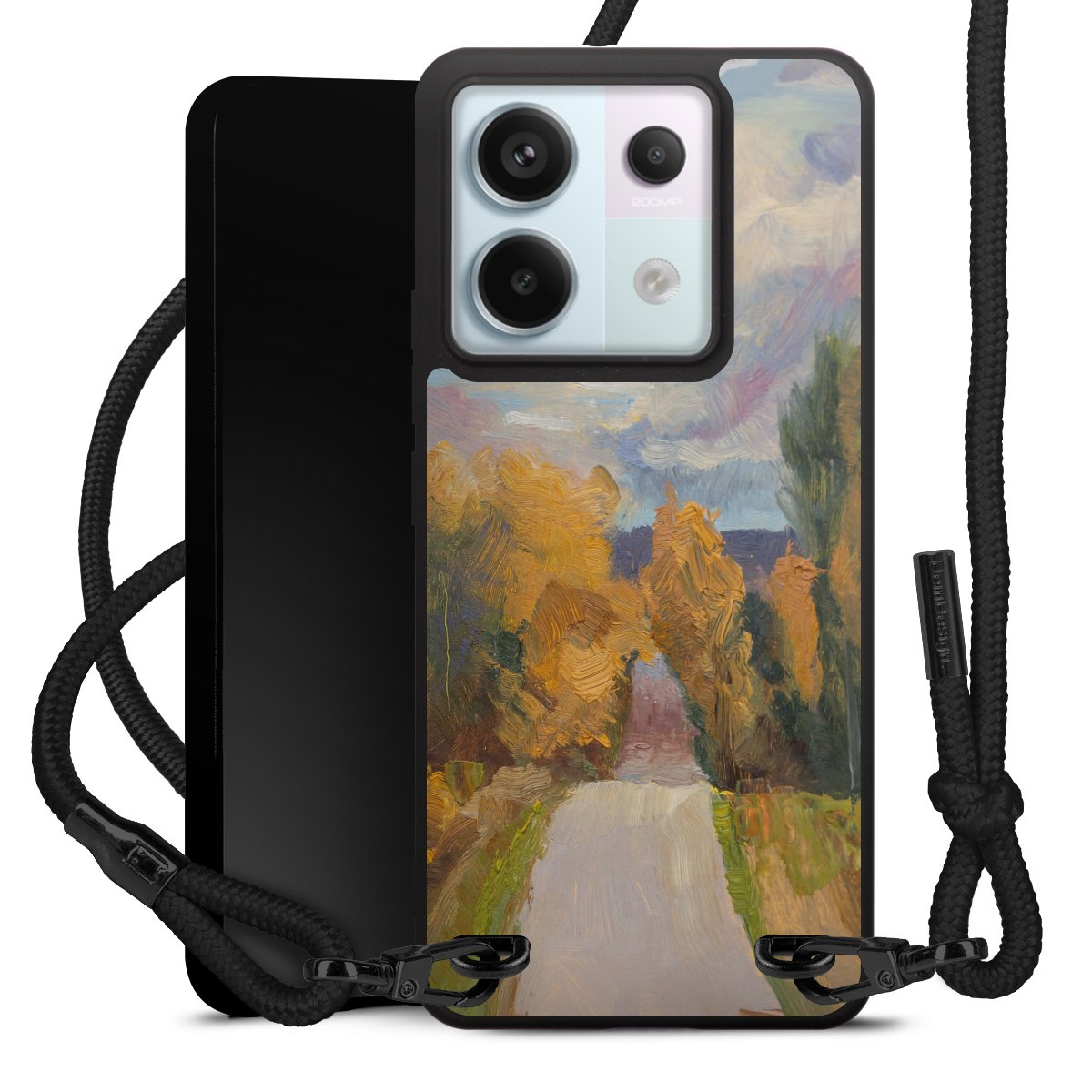 The matt black silicone case is made of flexible TPU (thermoplastic polyurethane) and offers robust protection. The durable, unbreakable material makes the cover flexible and dimensionally stable at the same time. The matte surface makes your design stand out more and is less susceptible to fingerprints and dirt. The stylish trend accessory fits comfortably in the hand and is perfectly complemented by the fabric (polyester) mobile phone strap. The braided fabric strap is approx. 1.70 metres long with a diameter of approx. 0.5 cm. Due to the special knotting technique, the length of the strap can be adjusted by simply pulling it, so that you can adapt it individually to your wishes. The practical case to wear around your neck is available with the fabric strap in black. As a little icing on the cake, we have provided the strap with a chic metal fastener in matt black. The strap is securely fastened to the case with loops made of high-quality genuine leather and press studs. The ends of the fabric strap are covered with metallic end caps and thus protected from fraying.
