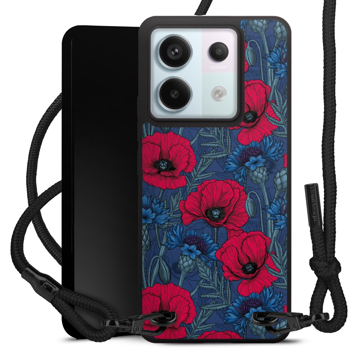 The matt black silicone case is made of flexible TPU (thermoplastic polyurethane) and offers robust protection. The durable, unbreakable material makes the cover flexible and dimensionally stable at the same time. The matte surface makes your design stand out more and is less susceptible to fingerprints and dirt. The stylish trend accessory fits comfortably in the hand and is perfectly complemented by the fabric (polyester) mobile phone strap. The braided fabric strap is approx. 1.70 metres long with a diameter of approx. 0.5 cm. Due to the special knotting technique, the length of the strap can be adjusted by simply pulling it, so that you can adapt it individually to your wishes. The practical case to wear around your neck is available with the fabric strap in black. As a little icing on the cake, we have provided the strap with a chic metal fastener in matt black. The strap is securely fastened to the case with loops made of high-quality genuine leather and press studs. The ends of the fabric strap are covered with metallic end caps and thus protected from fraying.