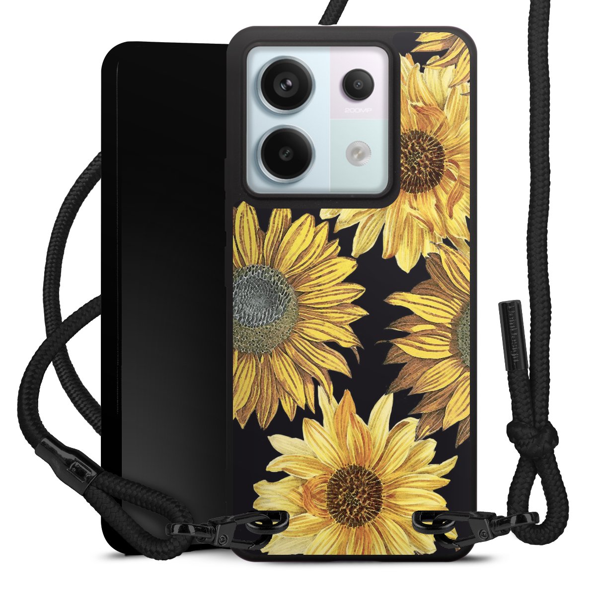 The matt black silicone case is made of flexible TPU (thermoplastic polyurethane) and offers robust protection. The durable, unbreakable material makes the cover flexible and dimensionally stable at the same time. The matte surface makes your design stand out more and is less susceptible to fingerprints and dirt. The stylish trend accessory fits comfortably in the hand and is perfectly complemented by the fabric (polyester) mobile phone strap. The braided fabric strap is approx. 1.70 metres long with a diameter of approx. 0.5 cm. Due to the special knotting technique, the length of the strap can be adjusted by simply pulling it, so that you can adapt it individually to your wishes. The practical case to wear around your neck is available with the fabric strap in black. As a little icing on the cake, we have provided the strap with a chic metal fastener in matt black. The strap is securely fastened to the case with loops made of high-quality genuine leather and press studs. The ends of the fabric strap are covered with metallic end caps and thus protected from fraying.