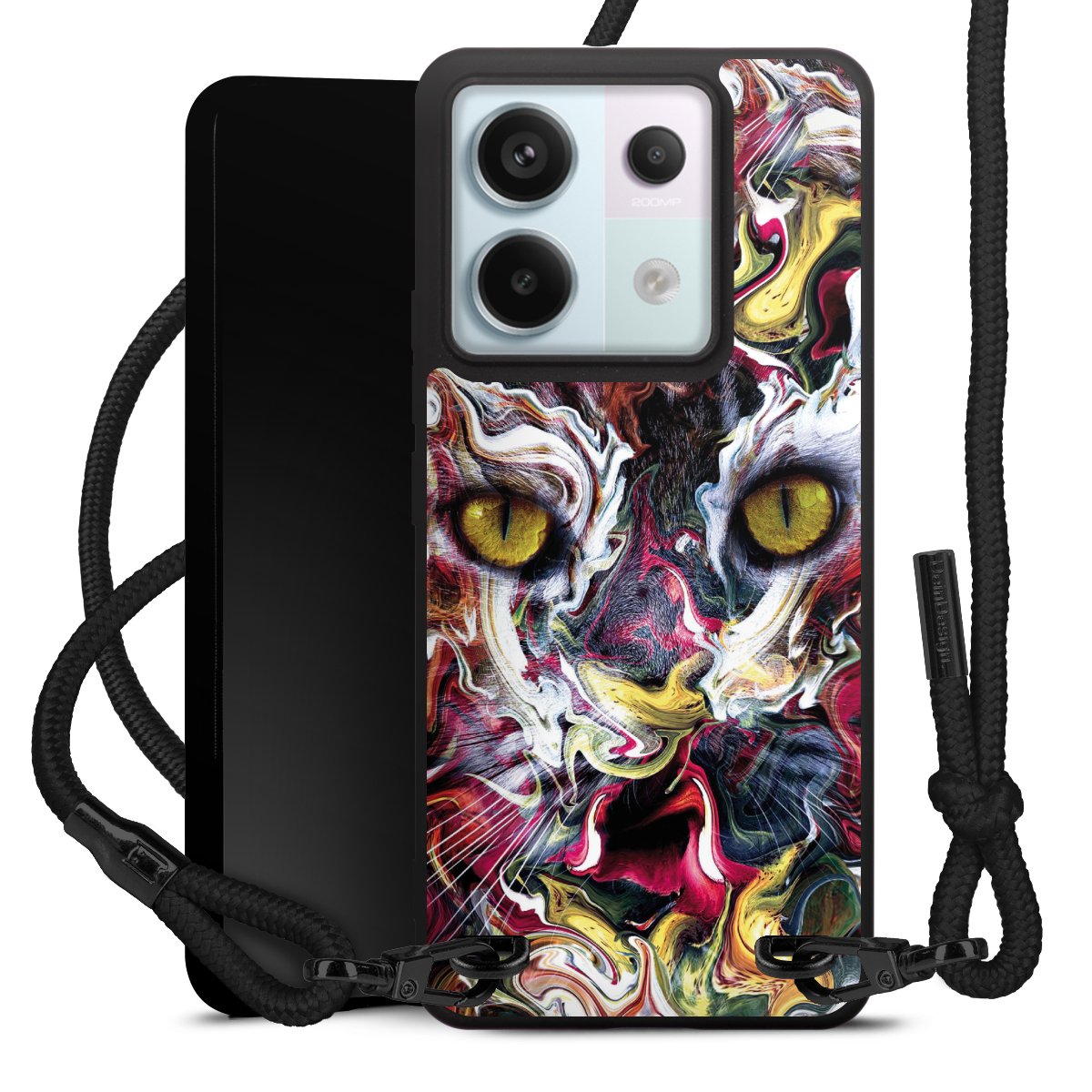 The matt black silicone case is made of flexible TPU (thermoplastic polyurethane) and offers robust protection. The durable, unbreakable material makes the cover flexible and dimensionally stable at the same time. The matte surface makes your design stand out more and is less susceptible to fingerprints and dirt. The stylish trend accessory fits comfortably in the hand and is perfectly complemented by the fabric (polyester) mobile phone strap. The braided fabric strap is approx. 1.70 metres long with a diameter of approx. 0.5 cm. Due to the special knotting technique, the length of the strap can be adjusted by simply pulling it, so that you can adapt it individually to your wishes. The practical case to wear around your neck is available with the fabric strap in black. As a little icing on the cake, we have provided the strap with a chic metal fastener in matt black. The strap is securely fastened to the case with loops made of high-quality genuine leather and press studs. The ends of the fabric strap are covered with metallic end caps and thus protected from fraying.
