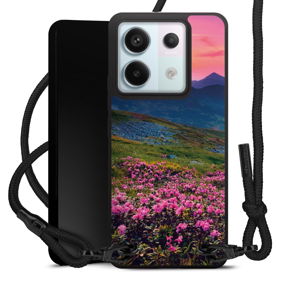 The matt black silicone case is made of flexible TPU (thermoplastic polyurethane) and offers robust protection. The durable, unbreakable material makes the cover flexible and dimensionally stable at the same time. The matte surface makes your design stand out more and is less susceptible to fingerprints and dirt. The stylish trend accessory fits comfortably in the hand and is perfectly complemented by the fabric (polyester) mobile phone strap. The braided fabric strap is approx. 1.70 metres long with a diameter of approx. 0.5 cm. Due to the special knotting technique, the length of the strap can be adjusted by simply pulling it, so that you can adapt it individually to your wishes. The practical case to wear around your neck is available with the fabric strap in black. As a little icing on the cake, we have provided the strap with a chic metal fastener in matt black. The strap is securely fastened to the case with loops made of high-quality genuine leather and press studs. The ends of the fabric strap are covered with metallic end caps and thus protected from fraying.