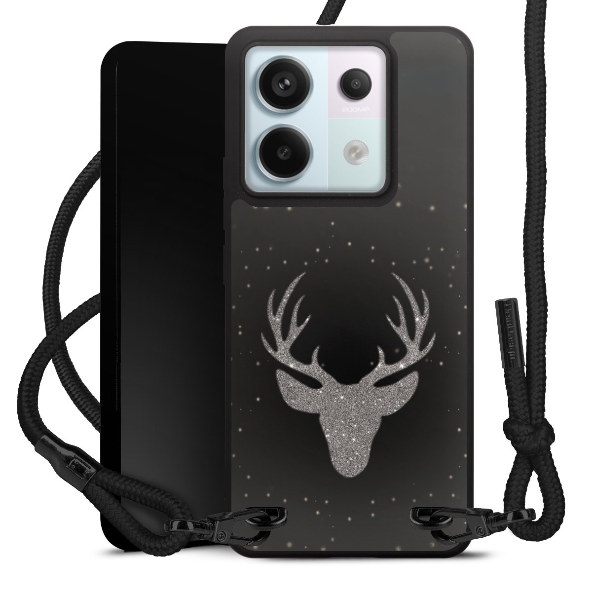The matt black silicone case is made of flexible TPU (thermoplastic polyurethane) and offers robust protection. The durable, unbreakable material makes the cover flexible and dimensionally stable at the same time. The matte surface makes your design stand out more and is less susceptible to fingerprints and dirt. The stylish trend accessory fits comfortably in the hand and is perfectly complemented by the fabric (polyester) mobile phone strap. The braided fabric strap is approx. 1.70 metres long with a diameter of approx. 0.5 cm. Due to the special knotting technique, the length of the strap can be adjusted by simply pulling it, so that you can adapt it individually to your wishes. The practical case to wear around your neck is available with the fabric strap in black. As a little icing on the cake, we have provided the strap with a chic metal fastener in matt black. The strap is securely fastened to the case with loops made of high-quality genuine leather and press studs. The ends of the fabric strap are covered with metallic end caps and thus protected from fraying.