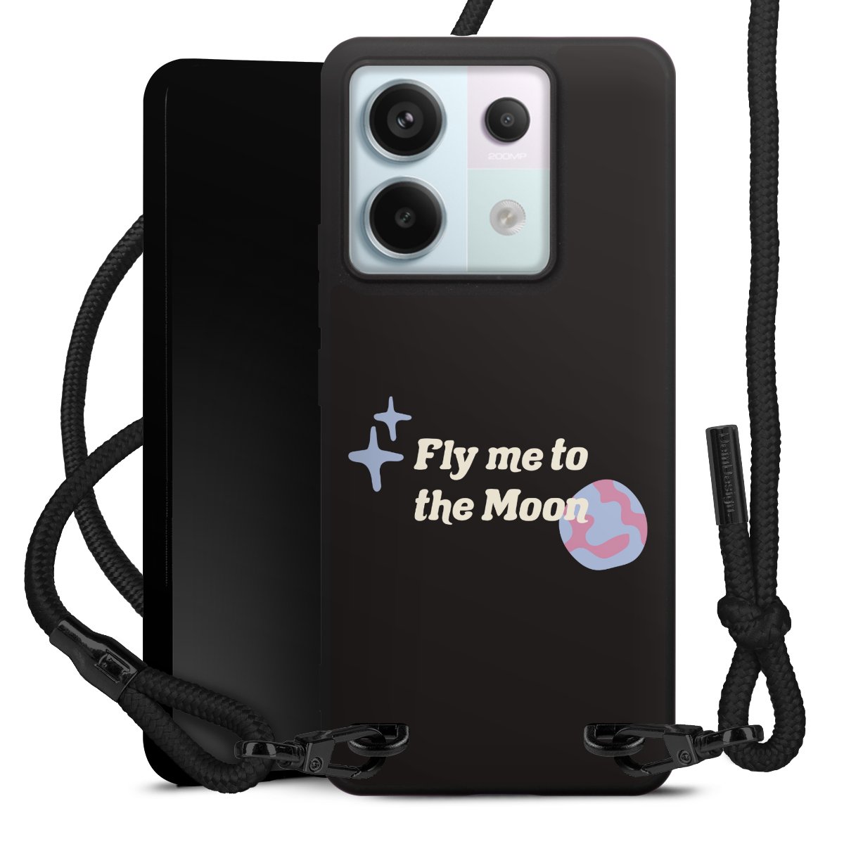 The matt black silicone case is made of flexible TPU (thermoplastic polyurethane) and offers robust protection. The durable, unbreakable material makes the cover flexible and dimensionally stable at the same time. The matte surface makes your design stand out more and is less susceptible to fingerprints and dirt. The stylish trend accessory fits comfortably in the hand and is perfectly complemented by the fabric (polyester) mobile phone strap. The braided fabric strap is approx. 1.70 metres long with a diameter of approx. 0.5 cm. Due to the special knotting technique, the length of the strap can be adjusted by simply pulling it, so that you can adapt it individually to your wishes. The practical case to wear around your neck is available with the fabric strap in black. As a little icing on the cake, we have provided the strap with a chic metal fastener in matt black. The strap is securely fastened to the case with loops made of high-quality genuine leather and press studs. The ends of the fabric strap are covered with metallic end caps and thus protected from fraying.