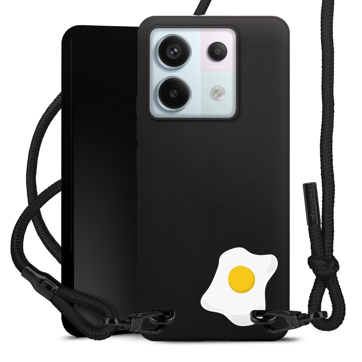 The matt black silicone case is made of flexible TPU (thermoplastic polyurethane) and offers robust protection. The durable, unbreakable material makes the cover flexible and dimensionally stable at the same time. The matte surface makes your design stand out more and is less susceptible to fingerprints and dirt. The stylish trend accessory fits comfortably in the hand and is perfectly complemented by the fabric (polyester) mobile phone strap. The braided fabric strap is approx. 1.70 metres long with a diameter of approx. 0.5 cm. Due to the special knotting technique, the length of the strap can be adjusted by simply pulling it, so that you can adapt it individually to your wishes. The practical case to wear around your neck is available with the fabric strap in black. As a little icing on the cake, we have provided the strap with a chic metal fastener in matt black. The strap is securely fastened to the case with loops made of high-quality genuine leather and press studs. The ends of the fabric strap are covered with metallic end caps and thus protected from fraying.