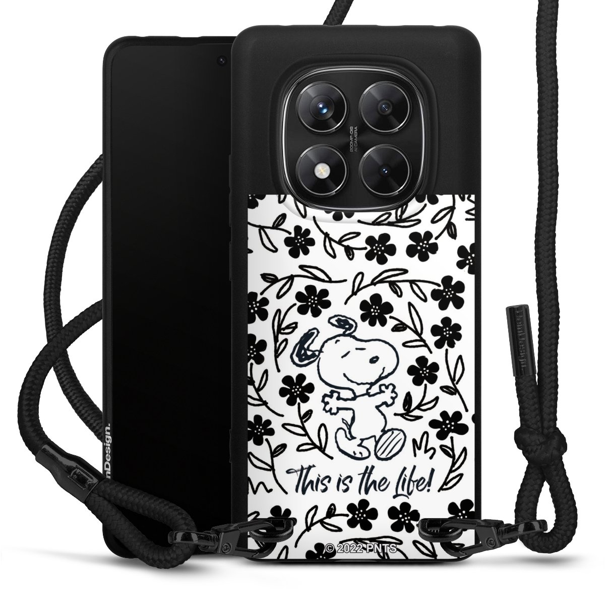 The matt black silicone case is made of flexible TPU (thermoplastic polyurethane) and offers robust protection. The durable, unbreakable material makes the cover flexible and dimensionally stable at the same time. The matte surface makes your design stand out more and is less susceptible to fingerprints and dirt. The stylish trend accessory fits comfortably in the hand and is perfectly complemented by the fabric (polyester) mobile phone strap. The braided fabric strap is approx. 1.70 metres long with a diameter of approx. 0.5 cm. Due to the special knotting technique, the length of the strap can be adjusted by simply pulling it, so that you can adapt it individually to your wishes. The practical case to wear around your neck is available with the fabric strap in black. As a little icing on the cake, we have provided the strap with a chic metal fastener in matt black. The strap is securely fastened to the case with loops made of high-quality genuine leather and press studs. The ends of the fabric strap are covered with metallic end caps and thus protected from fraying.