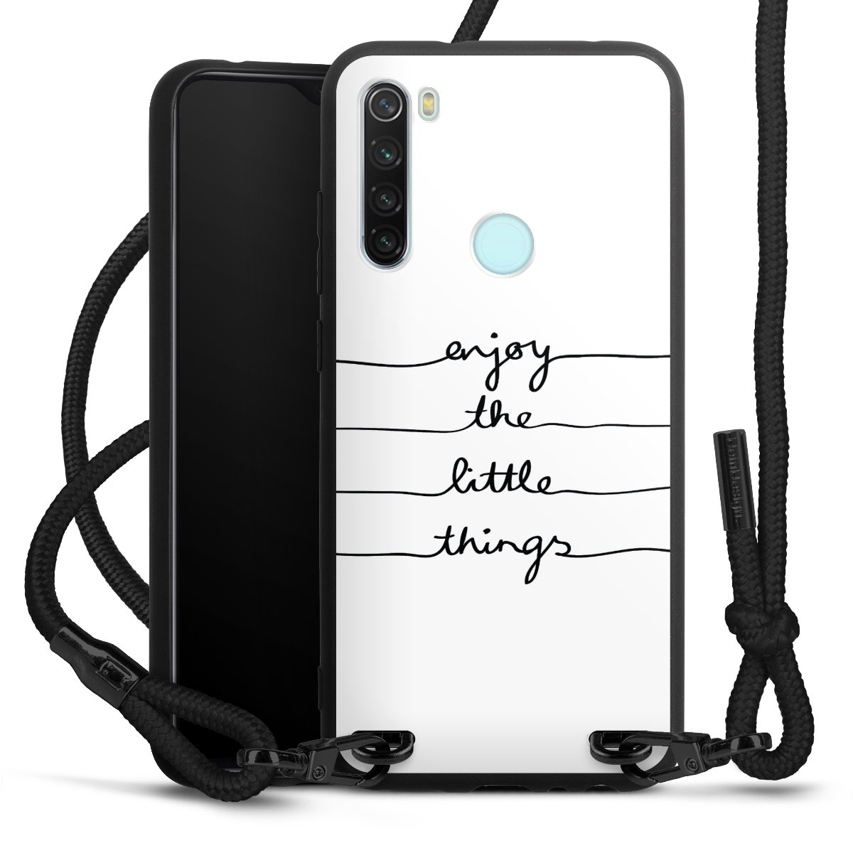 The matt black silicone case is made of flexible TPU (thermoplastic polyurethane) and offers robust protection. The durable, unbreakable material makes the cover flexible and dimensionally stable at the same time. The matte surface makes your design stand out more and is less susceptible to fingerprints and dirt. The stylish trend accessory fits comfortably in the hand and is perfectly complemented by the fabric (polyester) mobile phone strap. The braided fabric strap is approx. 1.70 metres long with a diameter of approx. 0.5 cm. Due to the special knotting technique, the length of the strap can be adjusted by simply pulling it, so that you can adapt it individually to your wishes. The practical case to wear around your neck is available with the fabric strap in black. As a little icing on the cake, we have provided the strap with a chic metal fastener in matt black. The strap is securely fastened to the case with loops made of high-quality genuine leather and press studs. The ends of the fabric strap are covered with metallic end caps and thus protected from fraying.