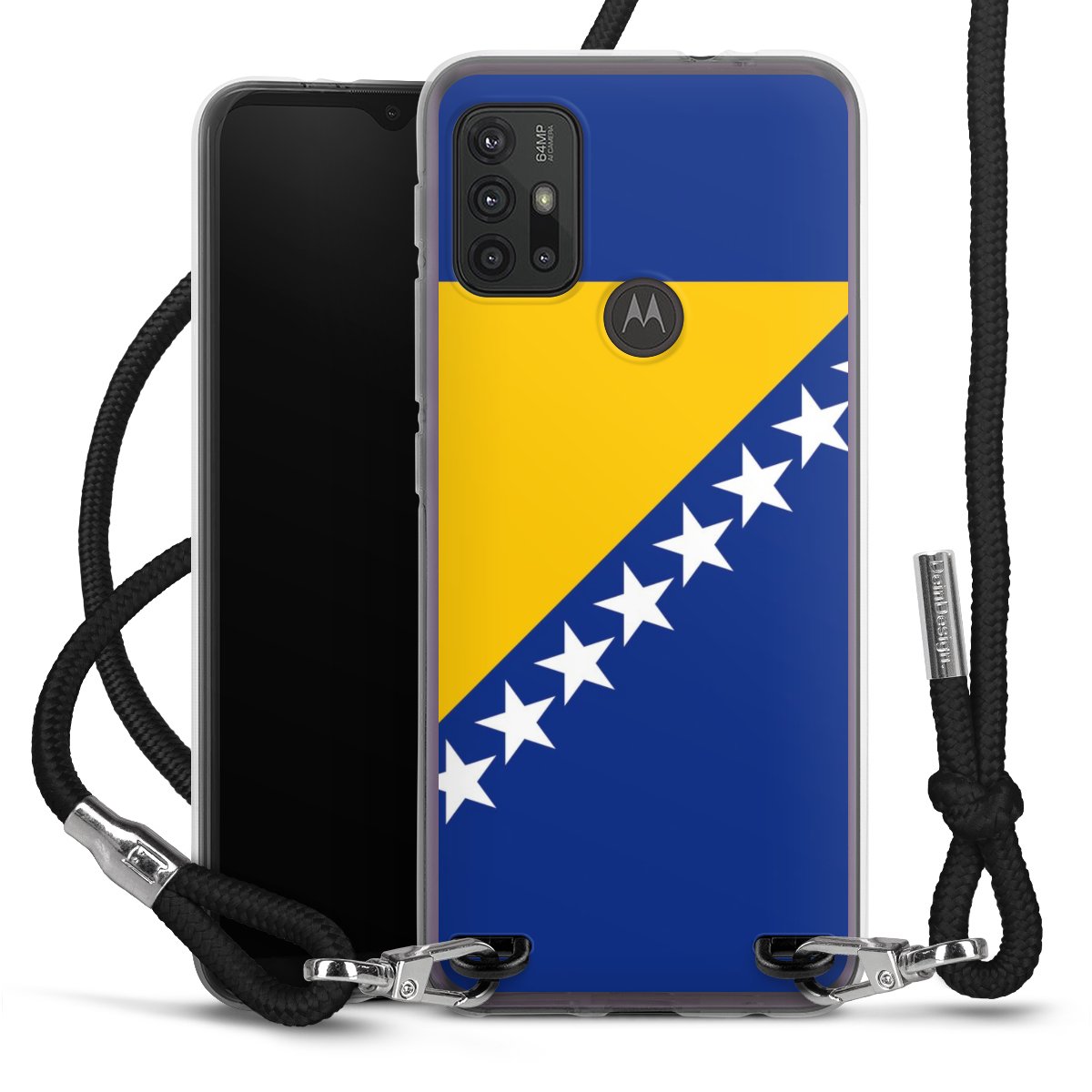 The flexible case is made from a high quality TPU material (thermoplastic Polyurethan). Thanks to its long-lasting and break resistant characteristics, the case is flexible yet consistent in form and has a great grip and feel. The textile strap made from Polyester gives a chic yet casual accent allowing you to carry your phone like a bag or necklace - a practical gadget perfect for your next adventure. The textile strap is about 1.70 meters long and the length can easily be adjusted through the knots. Our Carry Case is available in black, red, pink, grey, mustard, dark green and royal blue. We added a metal fastening to give the product an elegant touch. The ends of the textile strap are covered with metallic end caps to protect them against fraying.