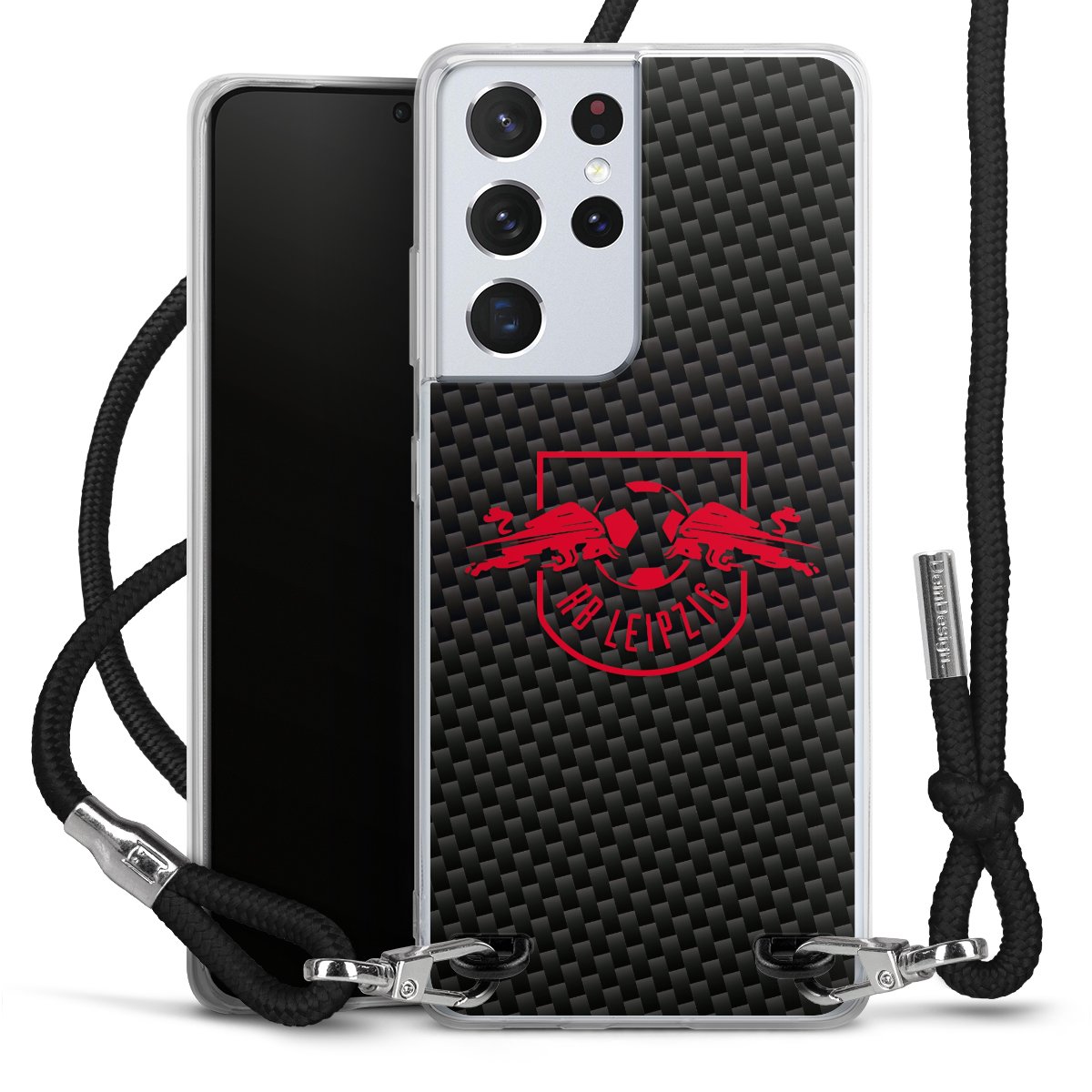 Red RB Leipzig logo on carbon look