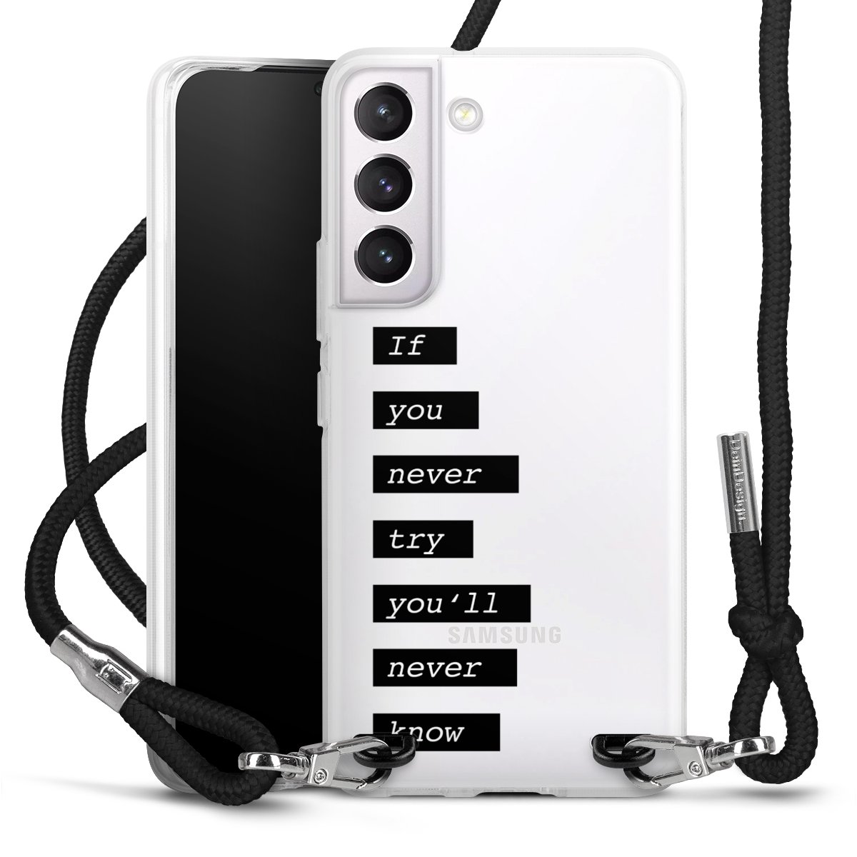 For our Carry Case we are using our advanced direct printing technology. The backside is fully printable, the frame is left unprinted. You can order the phone case without print, printed completely or also with a partial print. Choose one of our exclusive, pre-made shop designs or let your creativity shine and create your very own unique design with your pictures, overlays and text.