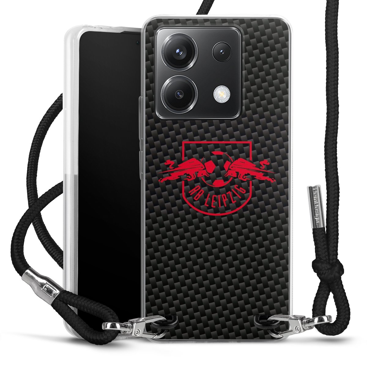 Red RB Leipzig logo on carbon look