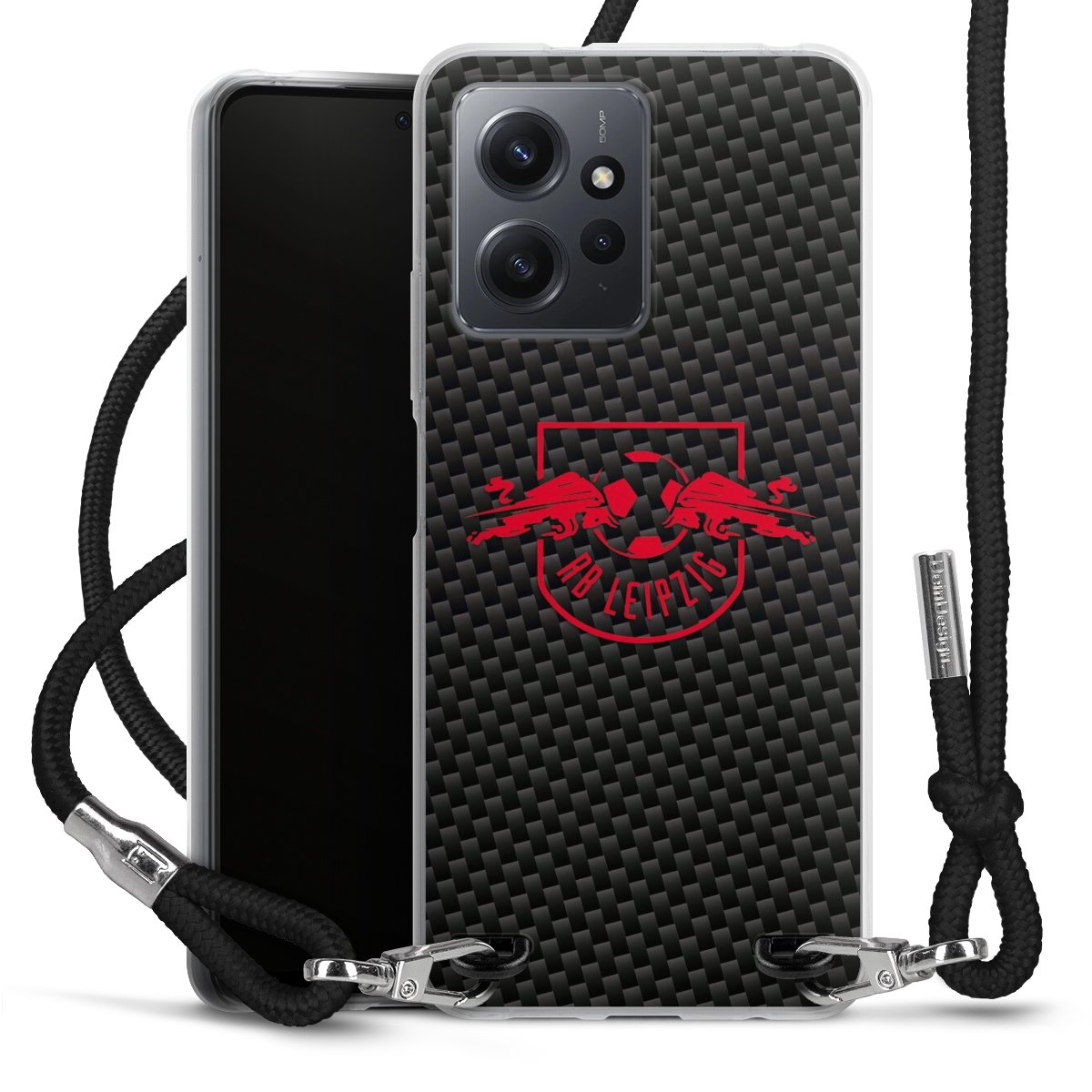 Red RB Leipzig logo on carbon look