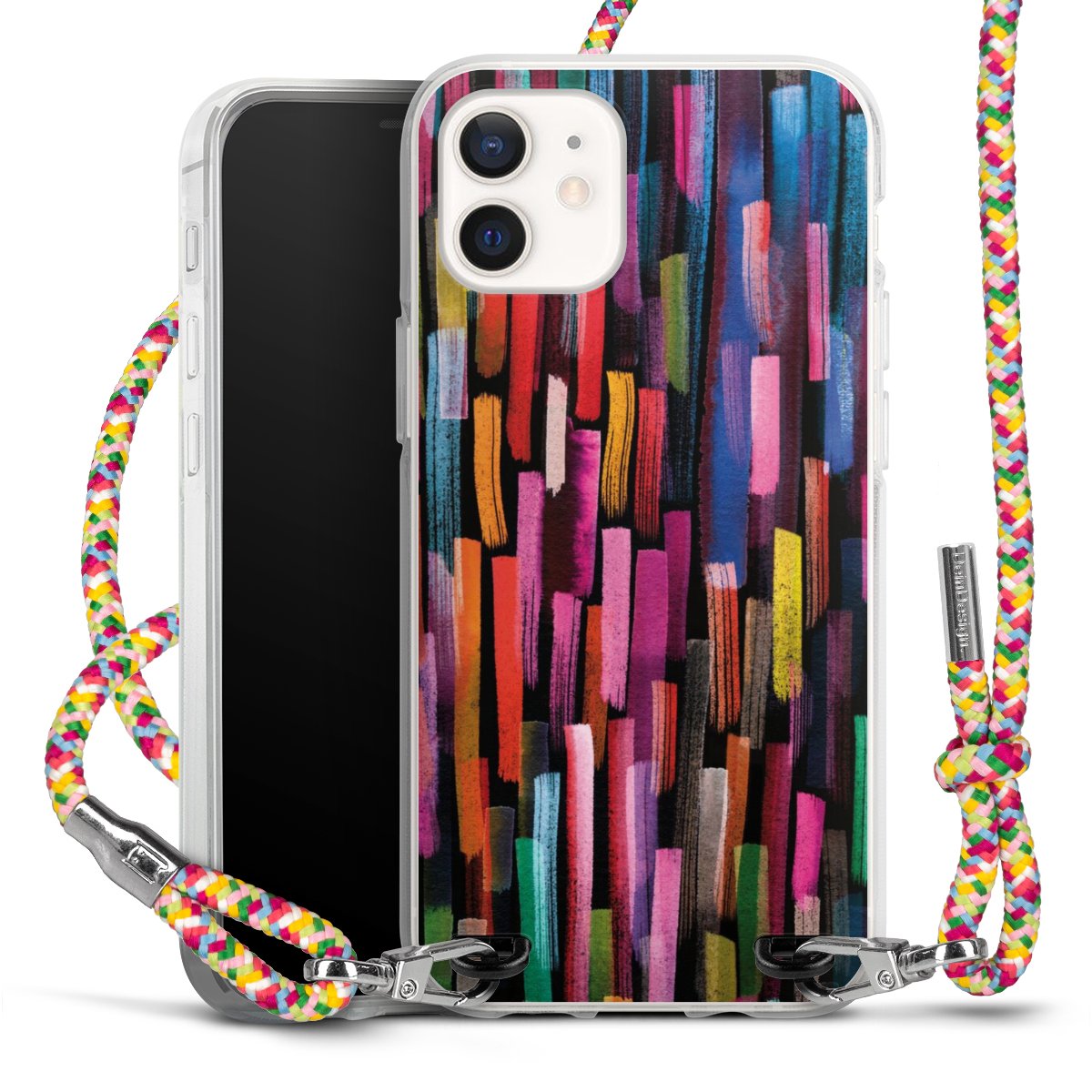 The flexible case is made from a highquality TPU material (thermoplastic Polyurethan). Thanks to its longlasting and break resistant characterisitcs, the case is flexible yet consistent in form and has a great grip and feel. The textile strap made from Polyester gives a chic yet casual accent allowing you to carry your phone like a bag or necklace - a practical gadget perfect for your next adventure. The textile strap is about 1.70 meters long and the length can easily be adjusted through the knots. Our Carry Case is available in Colourful, Mint-Camouflage, Very-Berry, Sahara-Sand and Sparkling-Neon. The ends of the textile strap are covered with metallic end caps to protect them against fraying.