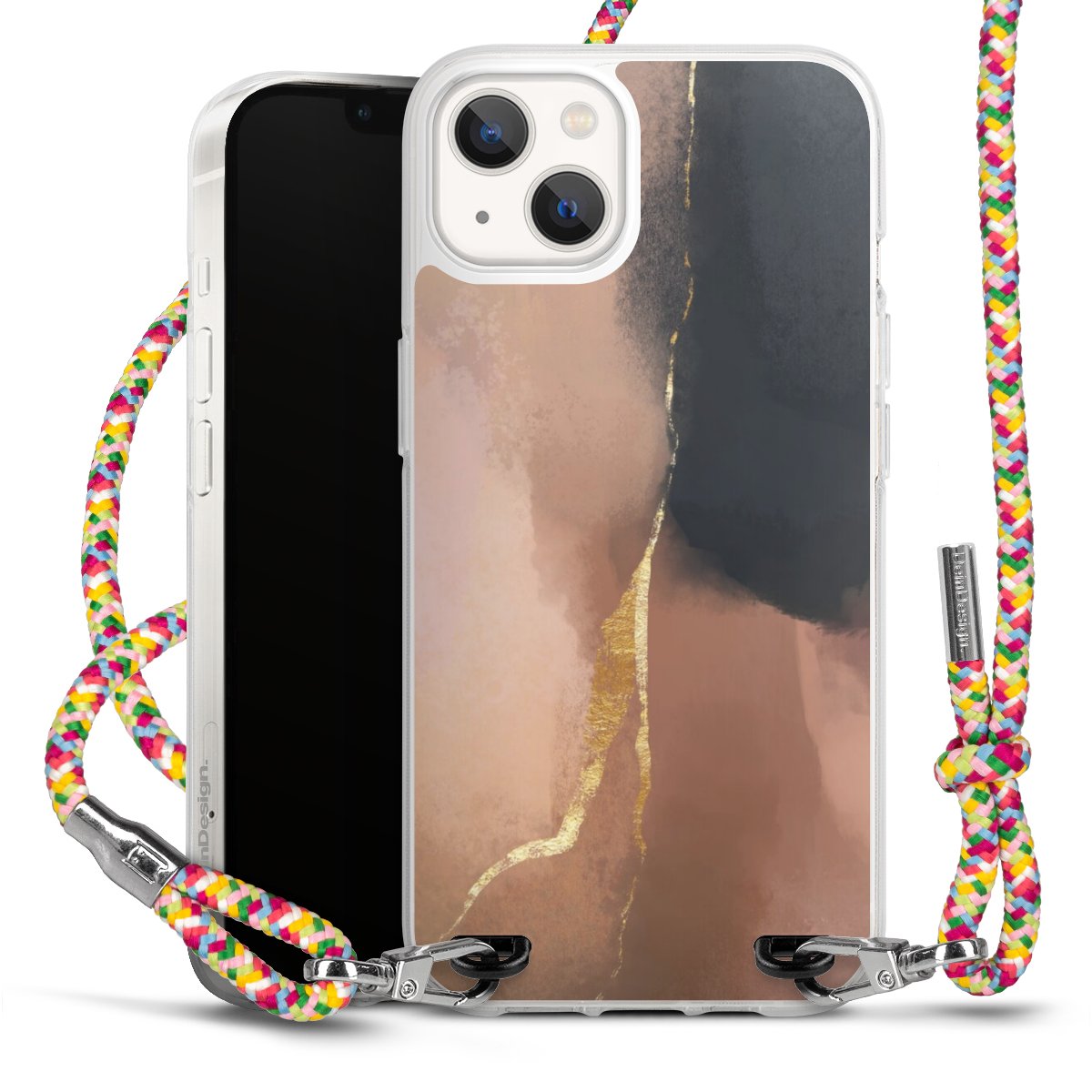 The flexible case is made from a highquality TPU material (thermoplastic Polyurethan). Thanks to its longlasting and break resistant characterisitcs, the case is flexible yet consistent in form and has a great grip and feel. The textile strap made from Polyester gives a chic yet casual accent allowing you to carry your phone like a bag or necklace - a practical gadget perfect for your next adventure. The textile strap is about 1.70 meters long and the length can easily be adjusted through the knots. Our Carry Case is available in Colourful, Mint-Camouflage, Very-Berry, Sahara-Sand and Sparkling-Neon. The ends of the textile strap are covered with metallic end caps to protect them against fraying.