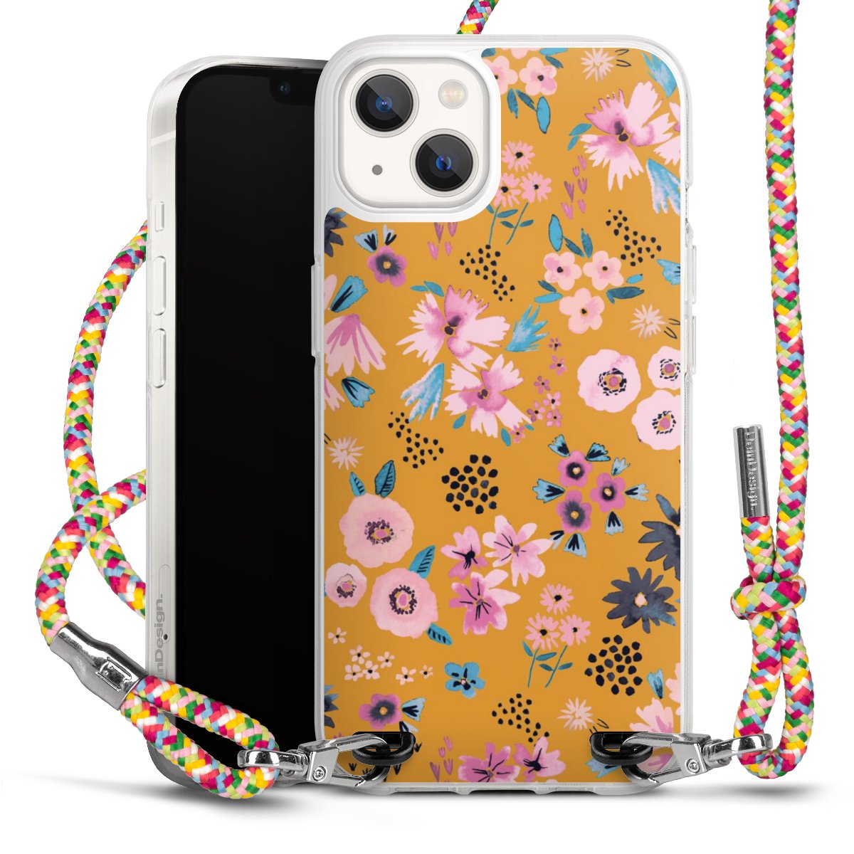 The flexible case is made from a highquality TPU material (thermoplastic Polyurethan). Thanks to its longlasting and break resistant characterisitcs, the case is flexible yet consistent in form and has a great grip and feel. The textile strap made from Polyester gives a chic yet casual accent allowing you to carry your phone like a bag or necklace - a practical gadget perfect for your next adventure. The textile strap is about 1.70 meters long and the length can easily be adjusted through the knots. Our Carry Case is available in Colourful, Mint-Camouflage, Very-Berry, Sahara-Sand and Sparkling-Neon. The ends of the textile strap are covered with metallic end caps to protect them against fraying.