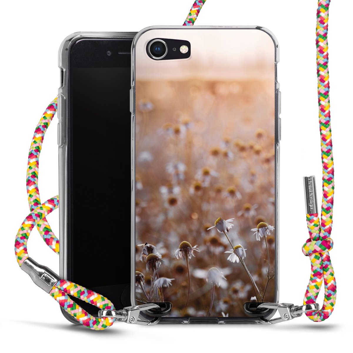 The flexible case is made from a highquality TPU material (thermoplastic Polyurethan). Thanks to its longlasting and break resistant characterisitcs, the case is flexible yet consistent in form and has a great grip and feel. The textile strap made from Polyester gives a chic yet casual accent allowing you to carry your phone like a bag or necklace - a practical gadget perfect for your next adventure. The textile strap is about 1.70 meters long and the length can easily be adjusted through the knots. Our Carry Case is available in Colourful, Mint-Camouflage, Very-Berry, Sahara-Sand and Sparkling-Neon. The ends of the textile strap are covered with metallic end caps to protect them against fraying.