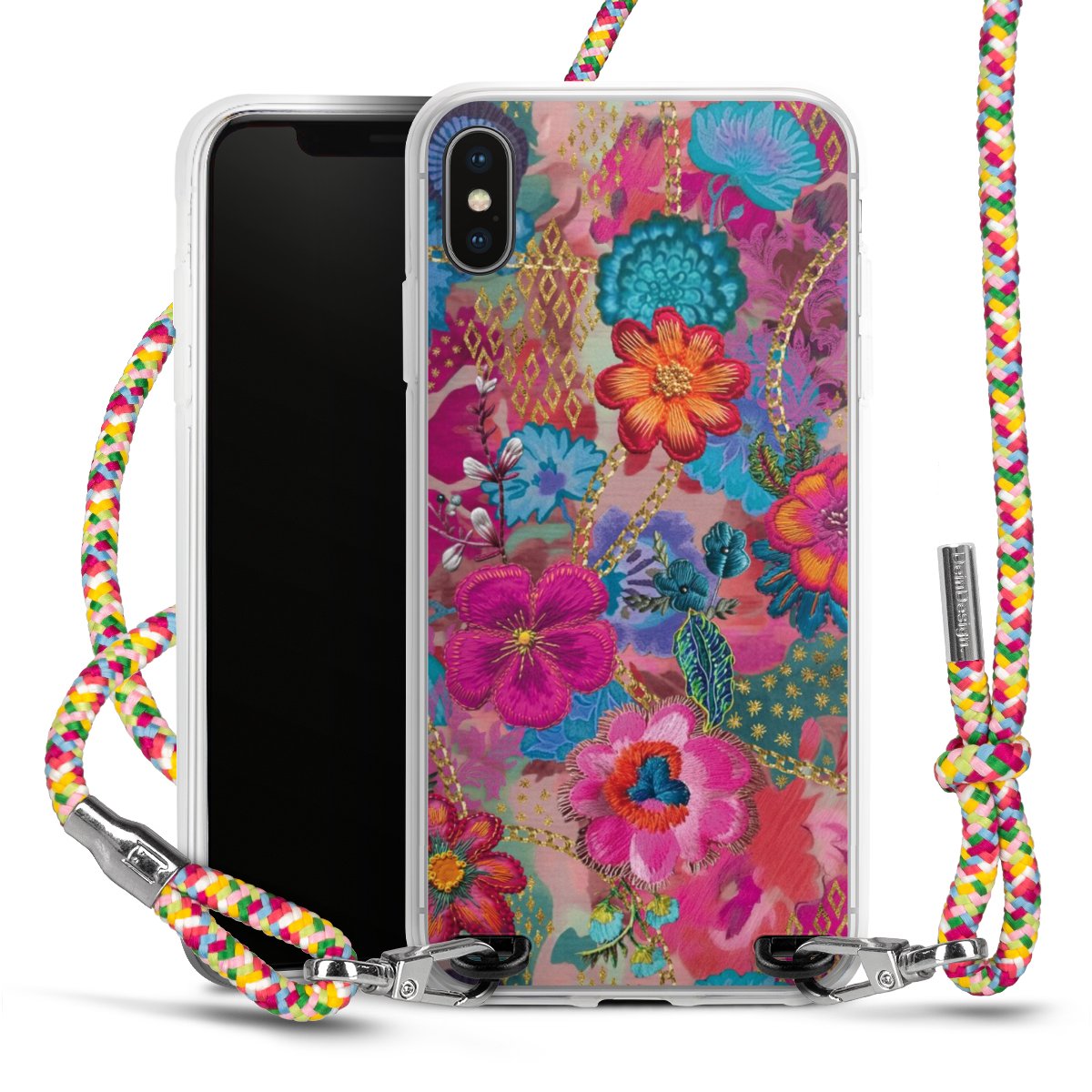 The flexible case is made from a highquality TPU material (thermoplastic Polyurethan). Thanks to its longlasting and break resistant characterisitcs, the case is flexible yet consistent in form and has a great grip and feel. The textile strap made from Polyester gives a chic yet casual accent allowing you to carry your phone like a bag or necklace - a practical gadget perfect for your next adventure. The textile strap is about 1.70 meters long and the length can easily be adjusted through the knots. Our Carry Case is available in Colourful, Mint-Camouflage, Very-Berry, Sahara-Sand and Sparkling-Neon. The ends of the textile strap are covered with metallic end caps to protect them against fraying.