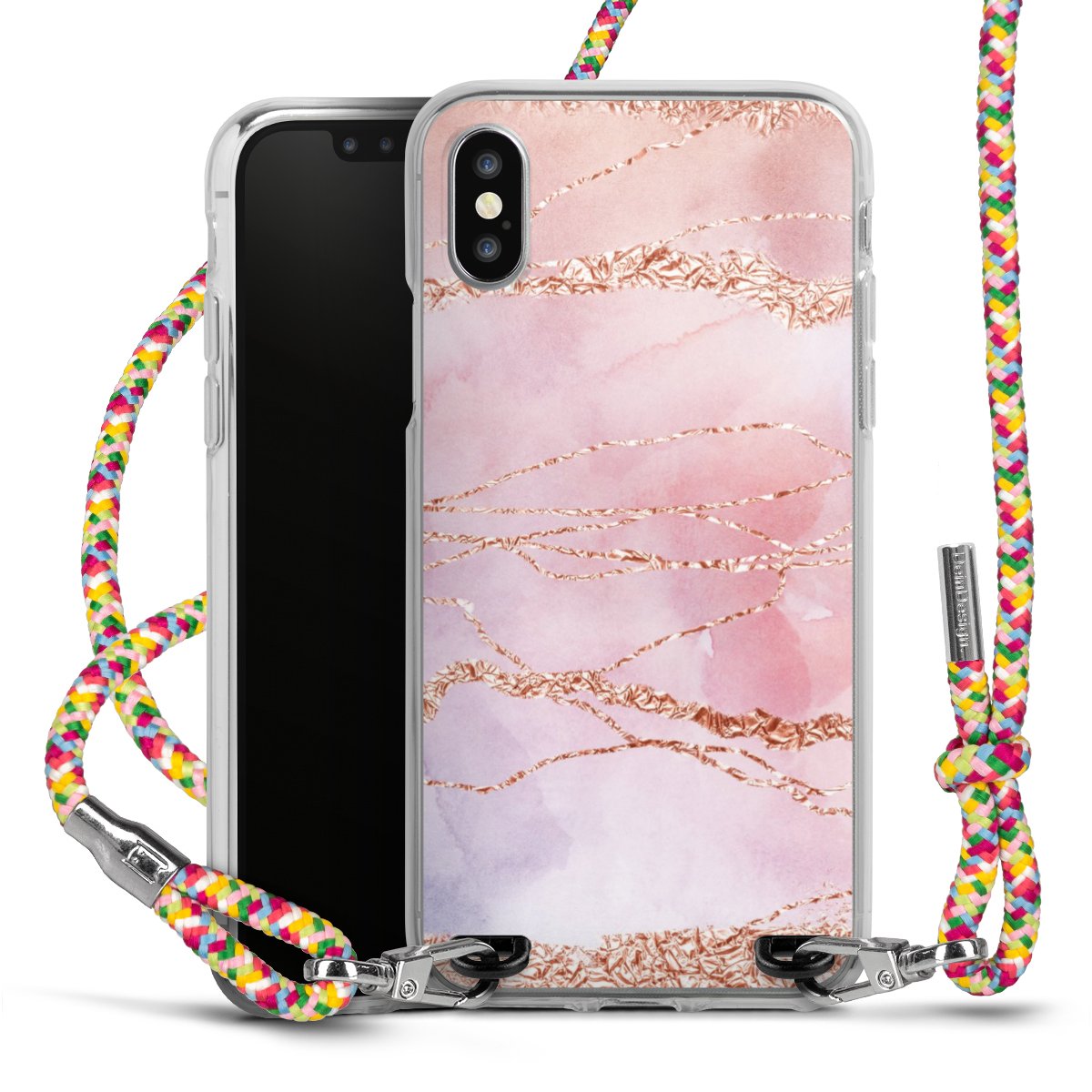The flexible case is made from a highquality TPU material (thermoplastic Polyurethan). Thanks to its longlasting and break resistant characterisitcs, the case is flexible yet consistent in form and has a great grip and feel. The textile strap made from Polyester gives a chic yet casual accent allowing you to carry your phone like a bag or necklace - a practical gadget perfect for your next adventure. The textile strap is about 1.70 meters long and the length can easily be adjusted through the knots. Our Carry Case is available in Colourful, Mint-Camouflage, Very-Berry, Sahara-Sand and Sparkling-Neon. The ends of the textile strap are covered with metallic end caps to protect them against fraying.