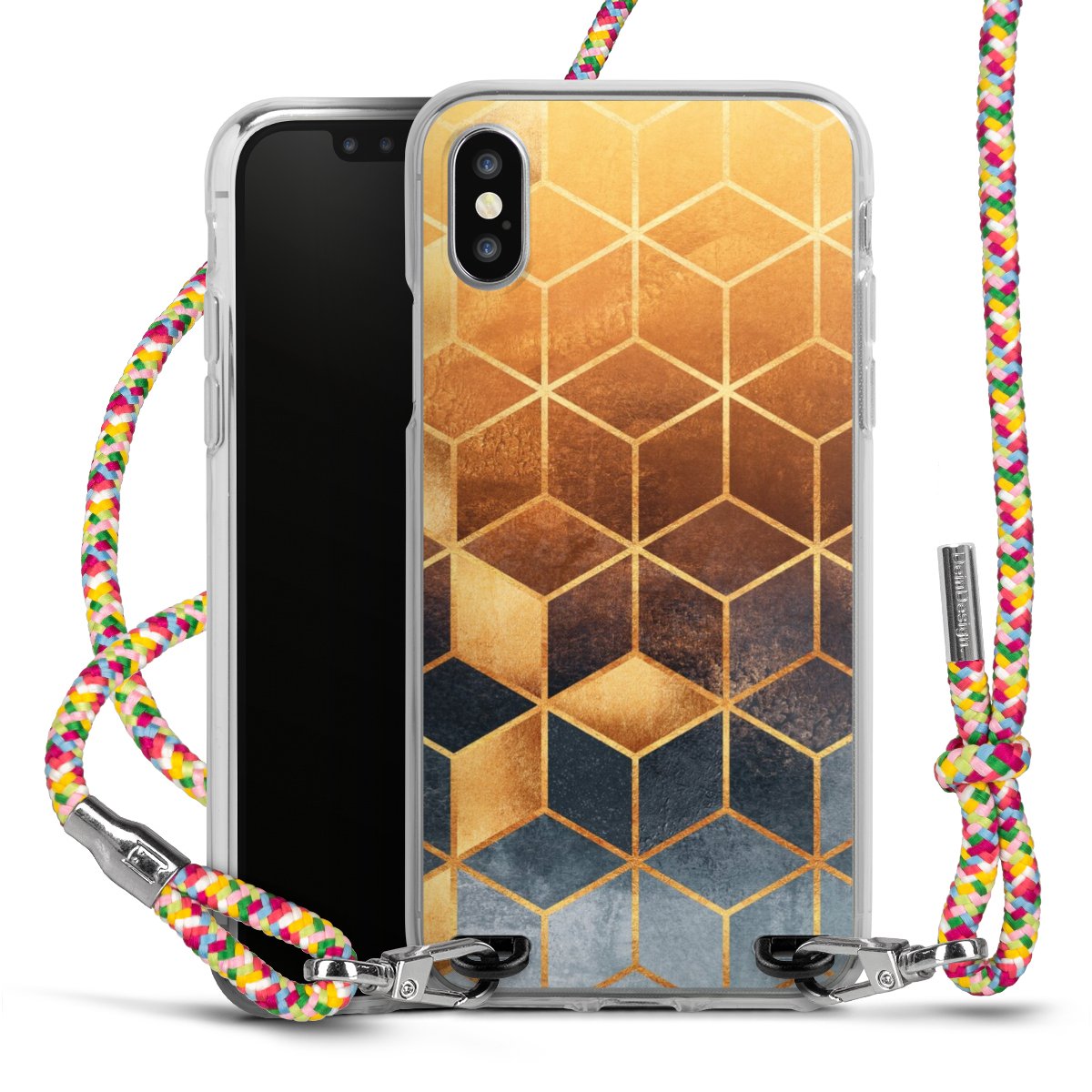 The flexible case is made from a highquality TPU material (thermoplastic Polyurethan). Thanks to its longlasting and break resistant characterisitcs, the case is flexible yet consistent in form and has a great grip and feel. The textile strap made from Polyester gives a chic yet casual accent allowing you to carry your phone like a bag or necklace - a practical gadget perfect for your next adventure. The textile strap is about 1.70 meters long and the length can easily be adjusted through the knots. Our Carry Case is available in Colourful, Mint-Camouflage, Very-Berry, Sahara-Sand and Sparkling-Neon. The ends of the textile strap are covered with metallic end caps to protect them against fraying.