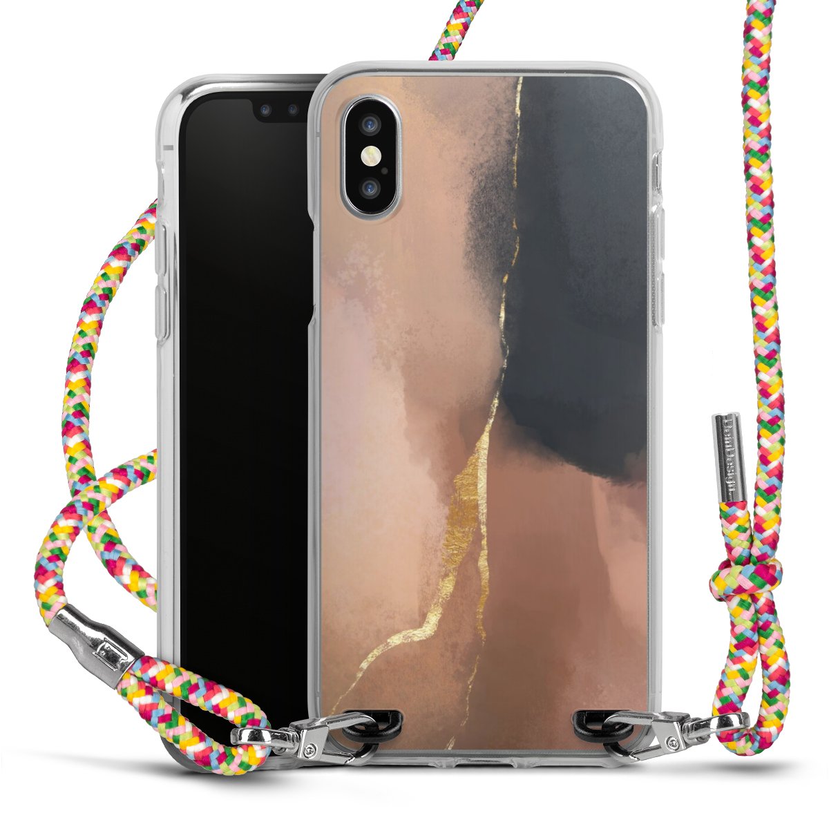 The flexible case is made from a highquality TPU material (thermoplastic Polyurethan). Thanks to its longlasting and break resistant characterisitcs, the case is flexible yet consistent in form and has a great grip and feel. The textile strap made from Polyester gives a chic yet casual accent allowing you to carry your phone like a bag or necklace - a practical gadget perfect for your next adventure. The textile strap is about 1.70 meters long and the length can easily be adjusted through the knots. Our Carry Case is available in Colourful, Mint-Camouflage, Very-Berry, Sahara-Sand and Sparkling-Neon. The ends of the textile strap are covered with metallic end caps to protect them against fraying.