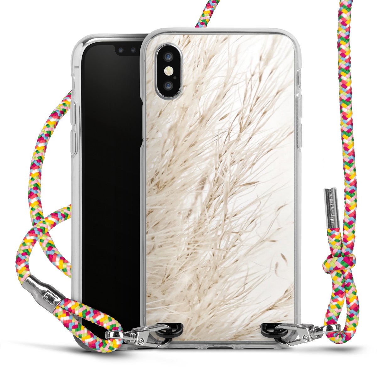 The flexible case is made from a highquality TPU material (thermoplastic Polyurethan). Thanks to its longlasting and break resistant characterisitcs, the case is flexible yet consistent in form and has a great grip and feel. The textile strap made from Polyester gives a chic yet casual accent allowing you to carry your phone like a bag or necklace - a practical gadget perfect for your next adventure. The textile strap is about 1.70 meters long and the length can easily be adjusted through the knots. Our Carry Case is available in Colourful, Mint-Camouflage, Very-Berry, Sahara-Sand and Sparkling-Neon. The ends of the textile strap are covered with metallic end caps to protect them against fraying.