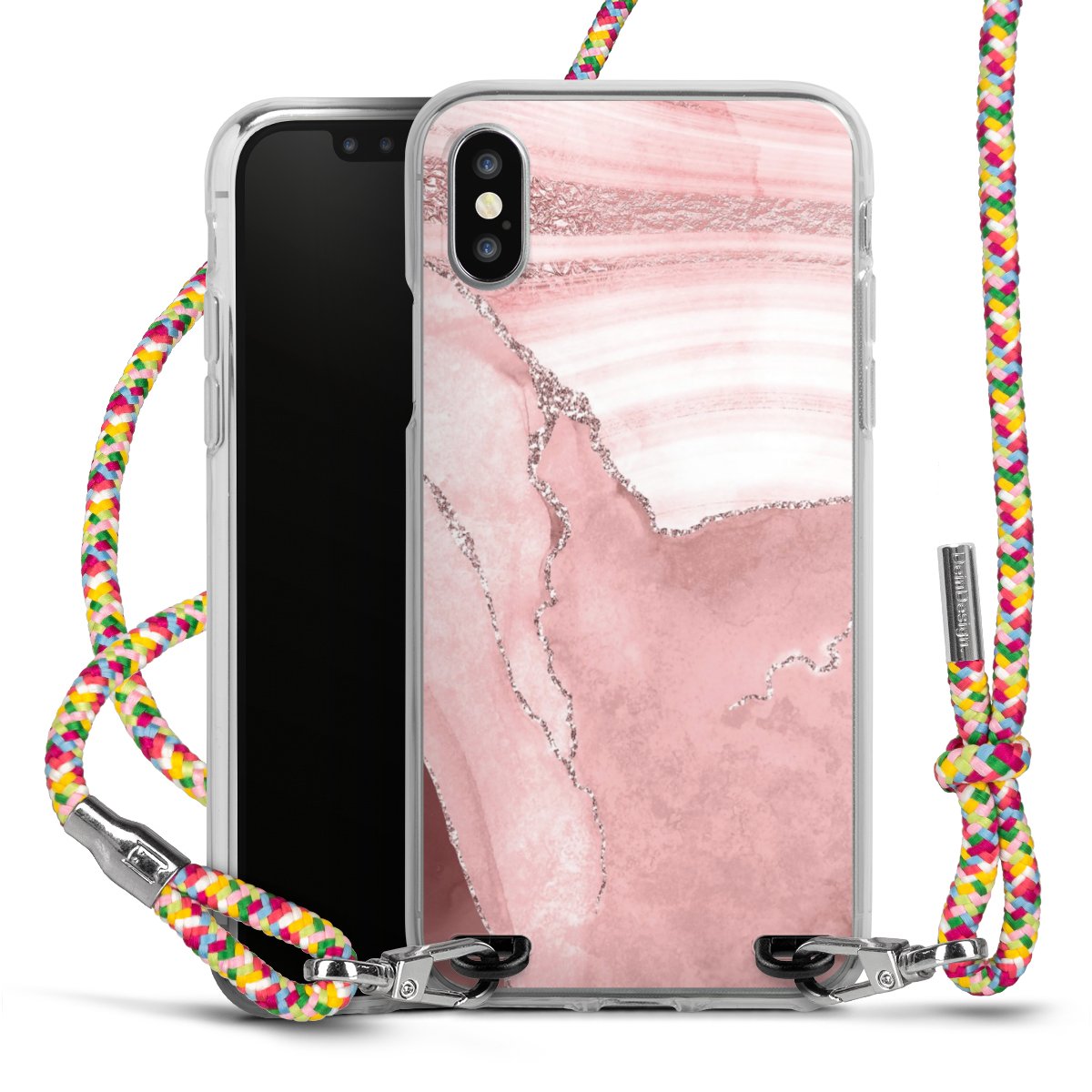 The flexible case is made from a highquality TPU material (thermoplastic Polyurethan). Thanks to its longlasting and break resistant characterisitcs, the case is flexible yet consistent in form and has a great grip and feel. The textile strap made from Polyester gives a chic yet casual accent allowing you to carry your phone like a bag or necklace - a practical gadget perfect for your next adventure. The textile strap is about 1.70 meters long and the length can easily be adjusted through the knots. Our Carry Case is available in Colourful, Mint-Camouflage, Very-Berry, Sahara-Sand and Sparkling-Neon. The ends of the textile strap are covered with metallic end caps to protect them against fraying.
