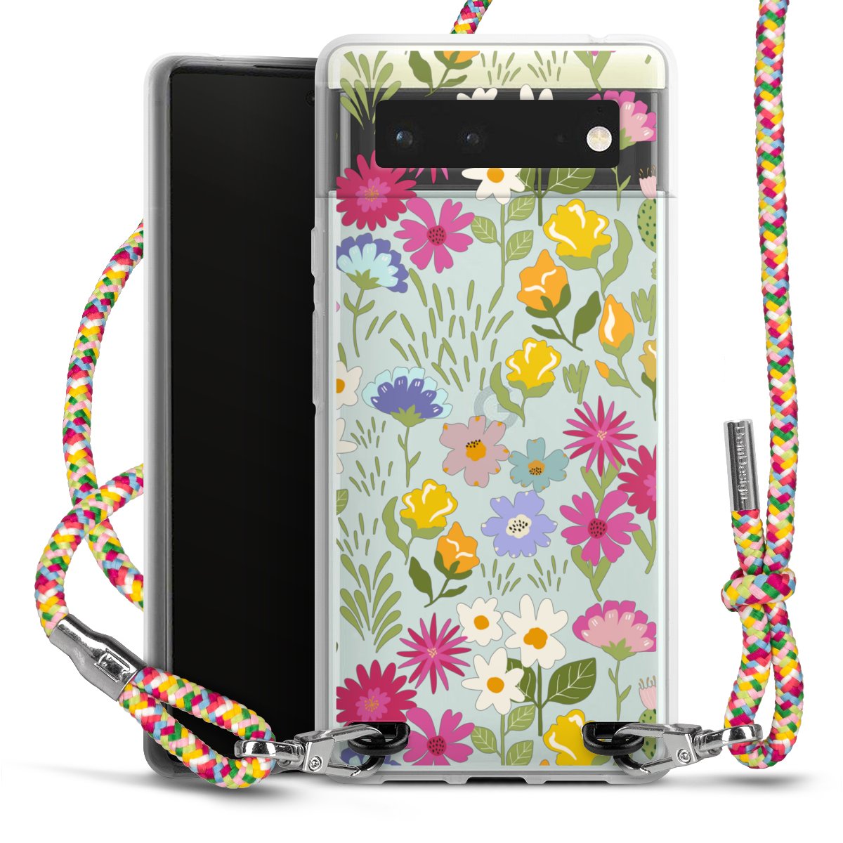 The flexible case is made from a highquality TPU material (thermoplastic Polyurethan). Thanks to its longlasting and break resistant characterisitcs, the case is flexible yet consistent in form and has a great grip and feel. The textile strap made from Polyester gives a chic yet casual accent allowing you to carry your phone like a bag or necklace - a practical gadget perfect for your next adventure. The textile strap is about 1.70 meters long and the length can easily be adjusted through the knots. Our Carry Case is available in Colourful, Mint-Camouflage, Very-Berry, Sahara-Sand and Sparkling-Neon. The ends of the textile strap are covered with metallic end caps to protect them against fraying.
