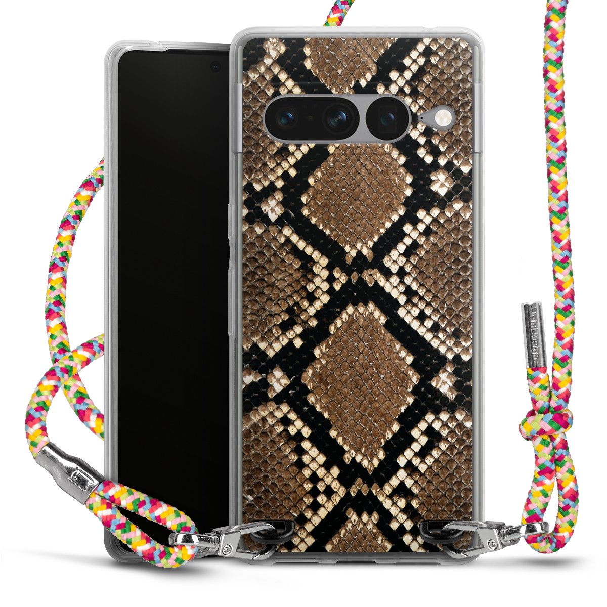 The flexible case is made from a highquality TPU material (thermoplastic Polyurethan). Thanks to its longlasting and break resistant characterisitcs, the case is flexible yet consistent in form and has a great grip and feel. The textile strap made from Polyester gives a chic yet casual accent allowing you to carry your phone like a bag or necklace - a practical gadget perfect for your next adventure. The textile strap is about 1.70 meters long and the length can easily be adjusted through the knots. Our Carry Case is available in Colourful, Mint-Camouflage, Very-Berry, Sahara-Sand and Sparkling-Neon. The ends of the textile strap are covered with metallic end caps to protect them against fraying.