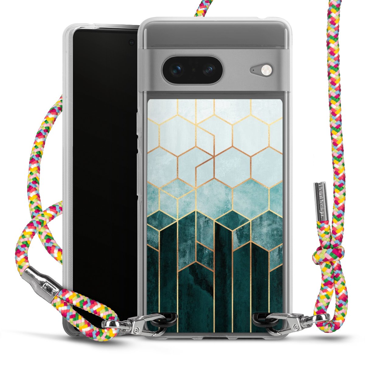 The flexible case is made from a highquality TPU material (thermoplastic Polyurethan). Thanks to its longlasting and break resistant characterisitcs, the case is flexible yet consistent in form and has a great grip and feel. The textile strap made from Polyester gives a chic yet casual accent allowing you to carry your phone like a bag or necklace - a practical gadget perfect for your next adventure. The textile strap is about 1.70 meters long and the length can easily be adjusted through the knots. Our Carry Case is available in Colourful, Mint-Camouflage, Very-Berry, Sahara-Sand and Sparkling-Neon. The ends of the textile strap are covered with metallic end caps to protect them against fraying.