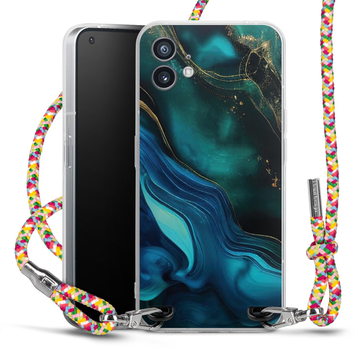 The flexible case is made from a highquality TPU material (thermoplastic Polyurethan). Thanks to its longlasting and break resistant characterisitcs, the case is flexible yet consistent in form and has a great grip and feel. The textile strap made from Polyester gives a chic yet casual accent allowing you to carry your phone like a bag or necklace - a practical gadget perfect for your next adventure. The textile strap is about 1.70 meters long and the length can easily be adjusted through the knots. Our Carry Case is available in Colourful, Mint-Camouflage, Very-Berry, Sahara-Sand and Sparkling-Neon. The ends of the textile strap are covered with metallic end caps to protect them against fraying.