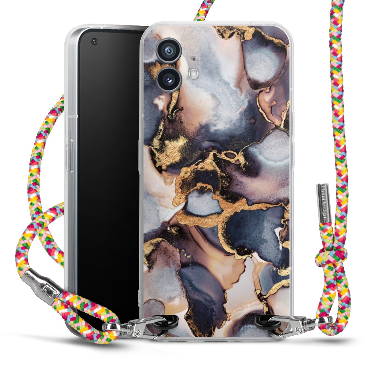The flexible case is made from a highquality TPU material (thermoplastic Polyurethan). Thanks to its longlasting and break resistant characterisitcs, the case is flexible yet consistent in form and has a great grip and feel. The textile strap made from Polyester gives a chic yet casual accent allowing you to carry your phone like a bag or necklace - a practical gadget perfect for your next adventure. The textile strap is about 1.70 meters long and the length can easily be adjusted through the knots. Our Carry Case is available in Colourful, Mint-Camouflage, Very-Berry, Sahara-Sand and Sparkling-Neon. The ends of the textile strap are covered with metallic end caps to protect them against fraying.