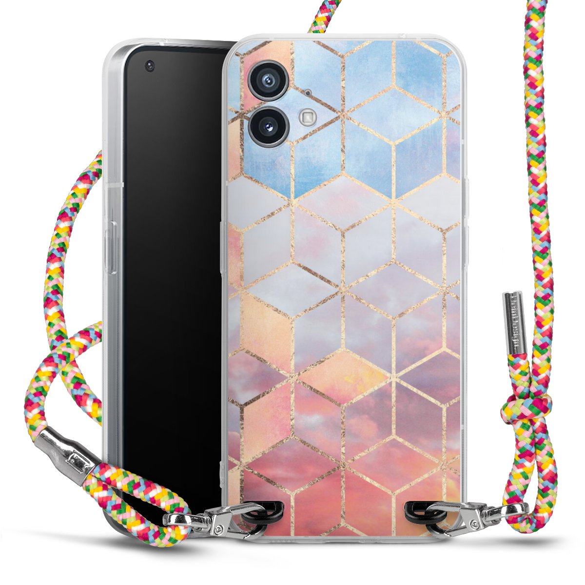 The flexible case is made from a highquality TPU material (thermoplastic Polyurethan). Thanks to its longlasting and break resistant characterisitcs, the case is flexible yet consistent in form and has a great grip and feel. The textile strap made from Polyester gives a chic yet casual accent allowing you to carry your phone like a bag or necklace - a practical gadget perfect for your next adventure. The textile strap is about 1.70 meters long and the length can easily be adjusted through the knots. Our Carry Case is available in Colourful, Mint-Camouflage, Very-Berry, Sahara-Sand and Sparkling-Neon. The ends of the textile strap are covered with metallic end caps to protect them against fraying.