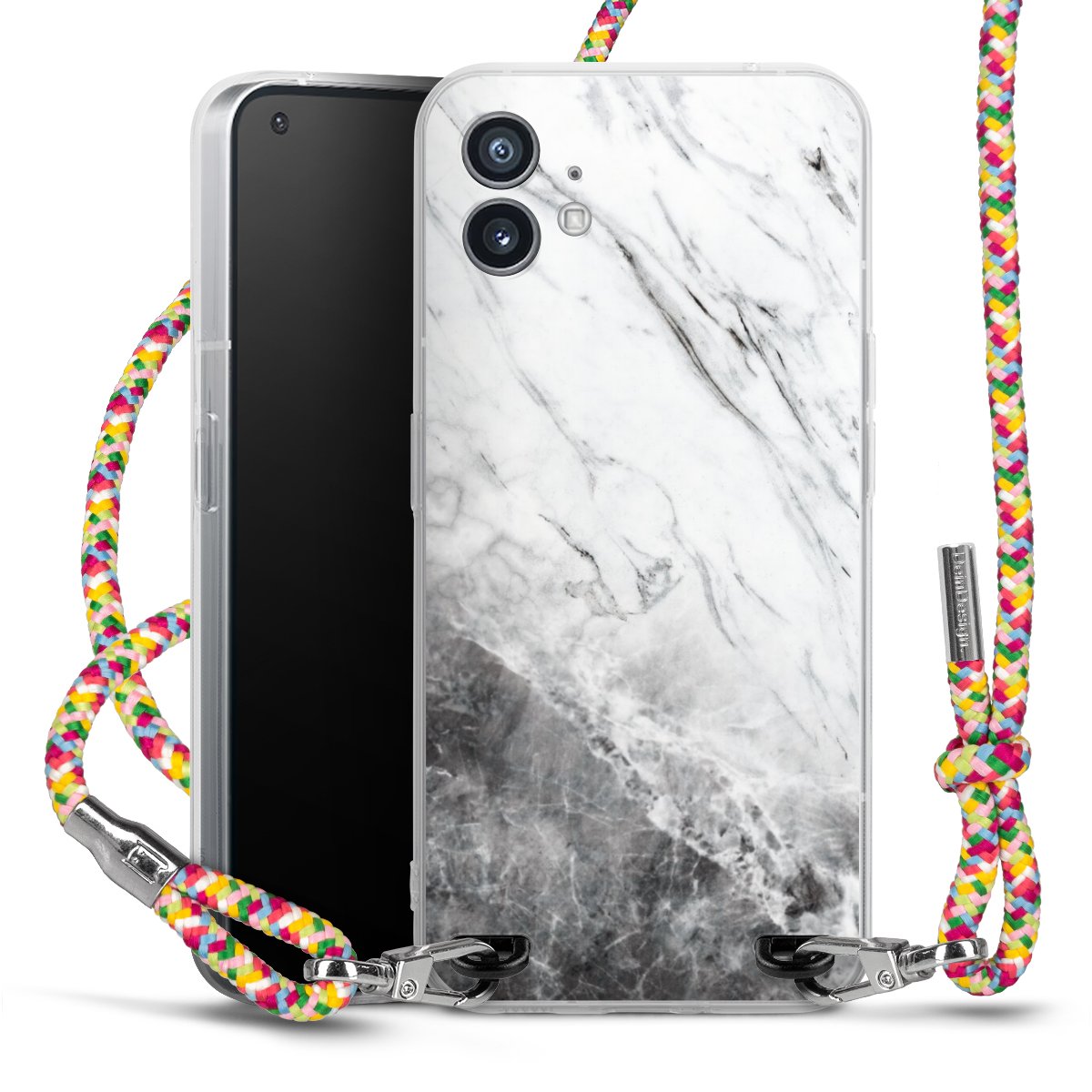 The flexible case is made from a highquality TPU material (thermoplastic Polyurethan). Thanks to its longlasting and break resistant characterisitcs, the case is flexible yet consistent in form and has a great grip and feel. The textile strap made from Polyester gives a chic yet casual accent allowing you to carry your phone like a bag or necklace - a practical gadget perfect for your next adventure. The textile strap is about 1.70 meters long and the length can easily be adjusted through the knots. Our Carry Case is available in Colourful, Mint-Camouflage, Very-Berry, Sahara-Sand and Sparkling-Neon. The ends of the textile strap are covered with metallic end caps to protect them against fraying.