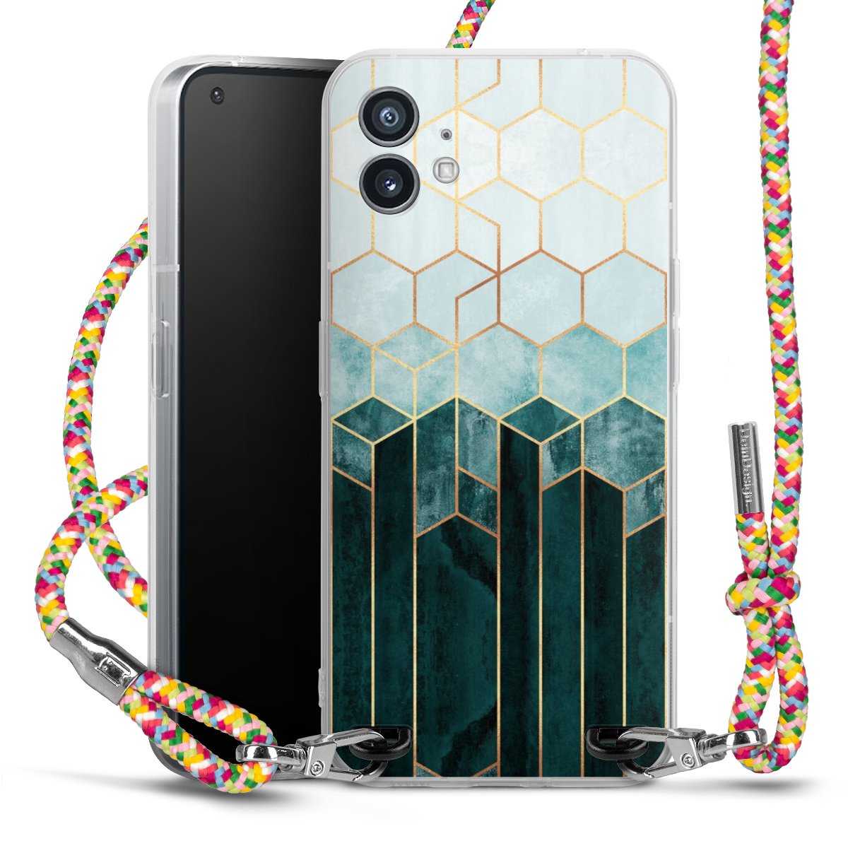 The flexible case is made from a highquality TPU material (thermoplastic Polyurethan). Thanks to its longlasting and break resistant characterisitcs, the case is flexible yet consistent in form and has a great grip and feel. The textile strap made from Polyester gives a chic yet casual accent allowing you to carry your phone like a bag or necklace - a practical gadget perfect for your next adventure. The textile strap is about 1.70 meters long and the length can easily be adjusted through the knots. Our Carry Case is available in Colourful, Mint-Camouflage, Very-Berry, Sahara-Sand and Sparkling-Neon. The ends of the textile strap are covered with metallic end caps to protect them against fraying.