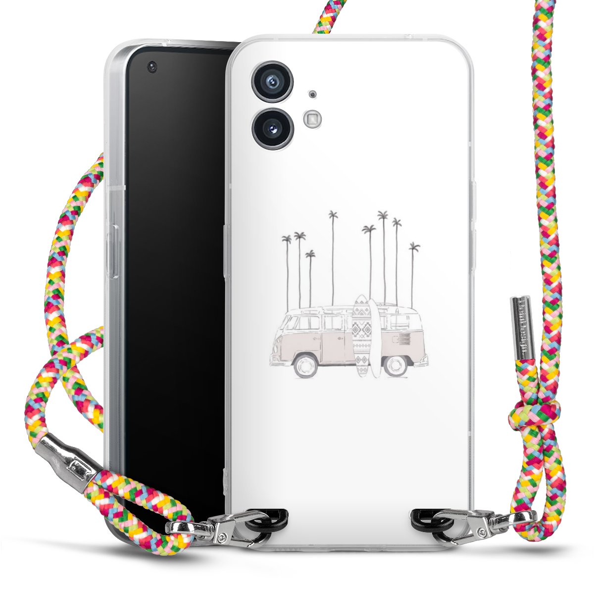 The flexible case is made from a highquality TPU material (thermoplastic Polyurethan). Thanks to its longlasting and break resistant characterisitcs, the case is flexible yet consistent in form and has a great grip and feel. The textile strap made from Polyester gives a chic yet casual accent allowing you to carry your phone like a bag or necklace - a practical gadget perfect for your next adventure. The textile strap is about 1.70 meters long and the length can easily be adjusted through the knots. Our Carry Case is available in Colourful, Mint-Camouflage, Very-Berry, Sahara-Sand and Sparkling-Neon. The ends of the textile strap are covered with metallic end caps to protect them against fraying.