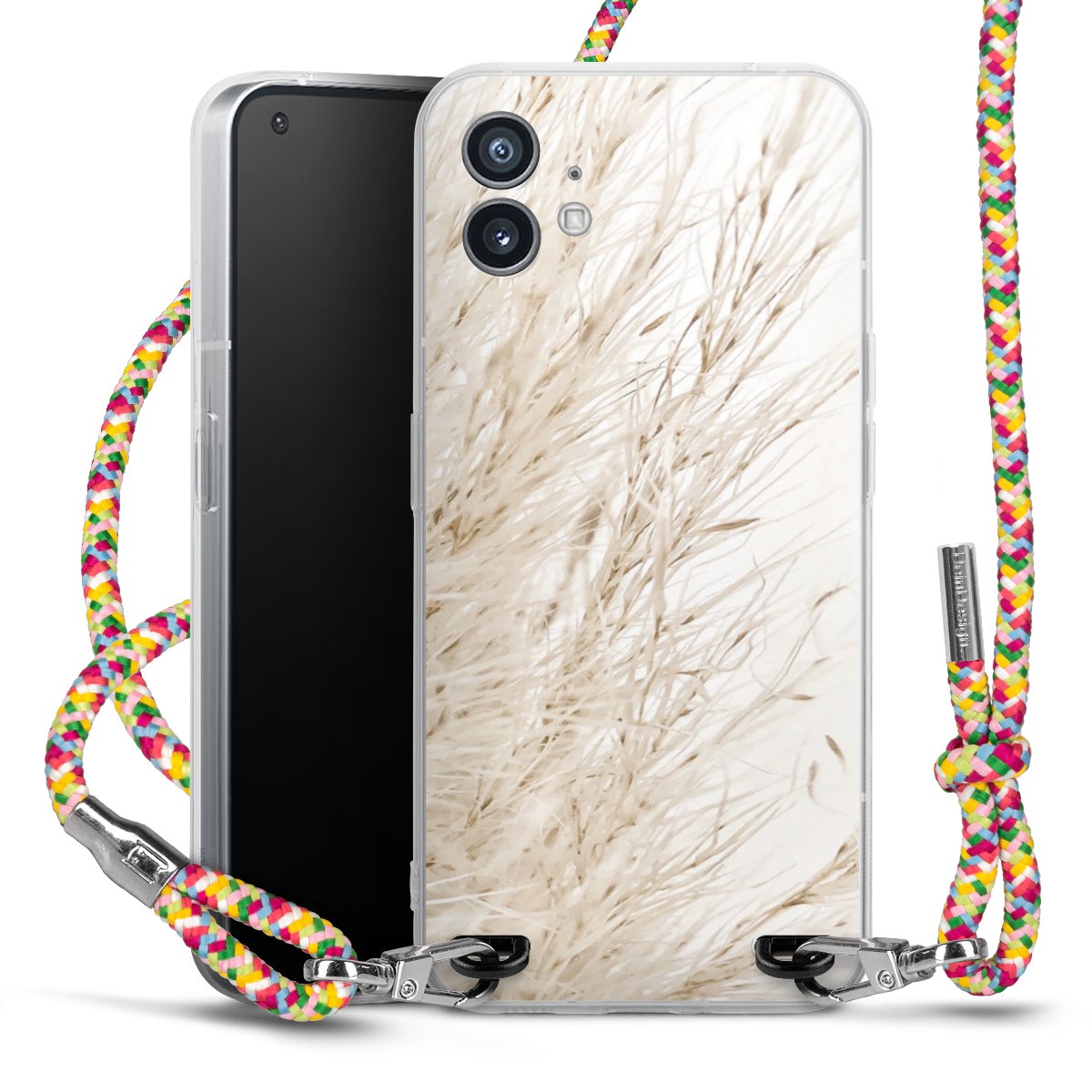 The flexible case is made from a highquality TPU material (thermoplastic Polyurethan). Thanks to its longlasting and break resistant characterisitcs, the case is flexible yet consistent in form and has a great grip and feel. The textile strap made from Polyester gives a chic yet casual accent allowing you to carry your phone like a bag or necklace - a practical gadget perfect for your next adventure. The textile strap is about 1.70 meters long and the length can easily be adjusted through the knots. Our Carry Case is available in Colourful, Mint-Camouflage, Very-Berry, Sahara-Sand and Sparkling-Neon. The ends of the textile strap are covered with metallic end caps to protect them against fraying.
