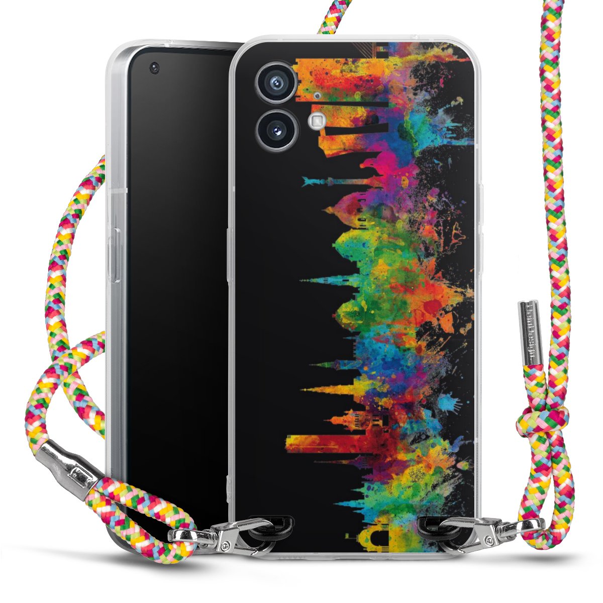 The flexible case is made from a highquality TPU material (thermoplastic Polyurethan). Thanks to its longlasting and break resistant characterisitcs, the case is flexible yet consistent in form and has a great grip and feel. The textile strap made from Polyester gives a chic yet casual accent allowing you to carry your phone like a bag or necklace - a practical gadget perfect for your next adventure. The textile strap is about 1.70 meters long and the length can easily be adjusted through the knots. Our Carry Case is available in Colourful, Mint-Camouflage, Very-Berry, Sahara-Sand and Sparkling-Neon. The ends of the textile strap are covered with metallic end caps to protect them against fraying.