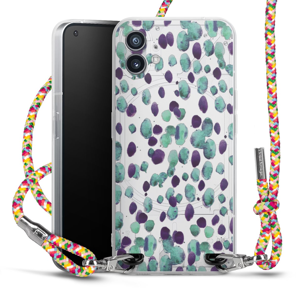 The flexible case is made from a highquality TPU material (thermoplastic Polyurethan). Thanks to its longlasting and break resistant characterisitcs, the case is flexible yet consistent in form and has a great grip and feel. The textile strap made from Polyester gives a chic yet casual accent allowing you to carry your phone like a bag or necklace - a practical gadget perfect for your next adventure. The textile strap is about 1.70 meters long and the length can easily be adjusted through the knots. Our Carry Case is available in Colourful, Mint-Camouflage, Very-Berry, Sahara-Sand and Sparkling-Neon. The ends of the textile strap are covered with metallic end caps to protect them against fraying.