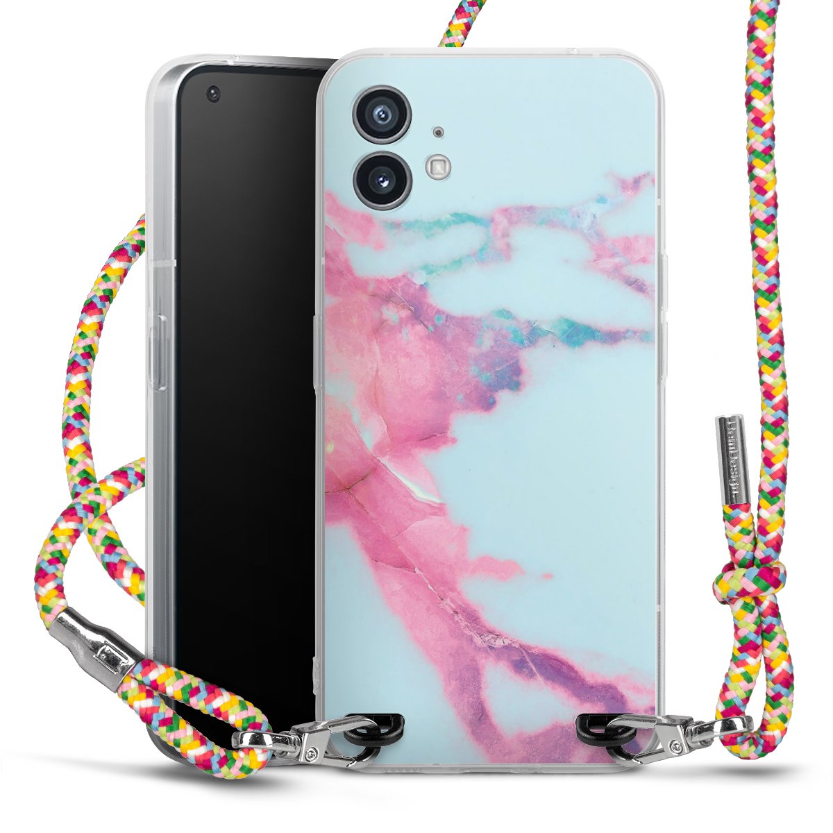The flexible case is made from a highquality TPU material (thermoplastic Polyurethan). Thanks to its longlasting and break resistant characterisitcs, the case is flexible yet consistent in form and has a great grip and feel. The textile strap made from Polyester gives a chic yet casual accent allowing you to carry your phone like a bag or necklace - a practical gadget perfect for your next adventure. The textile strap is about 1.70 meters long and the length can easily be adjusted through the knots. Our Carry Case is available in Colourful, Mint-Camouflage, Very-Berry, Sahara-Sand and Sparkling-Neon. The ends of the textile strap are covered with metallic end caps to protect them against fraying.