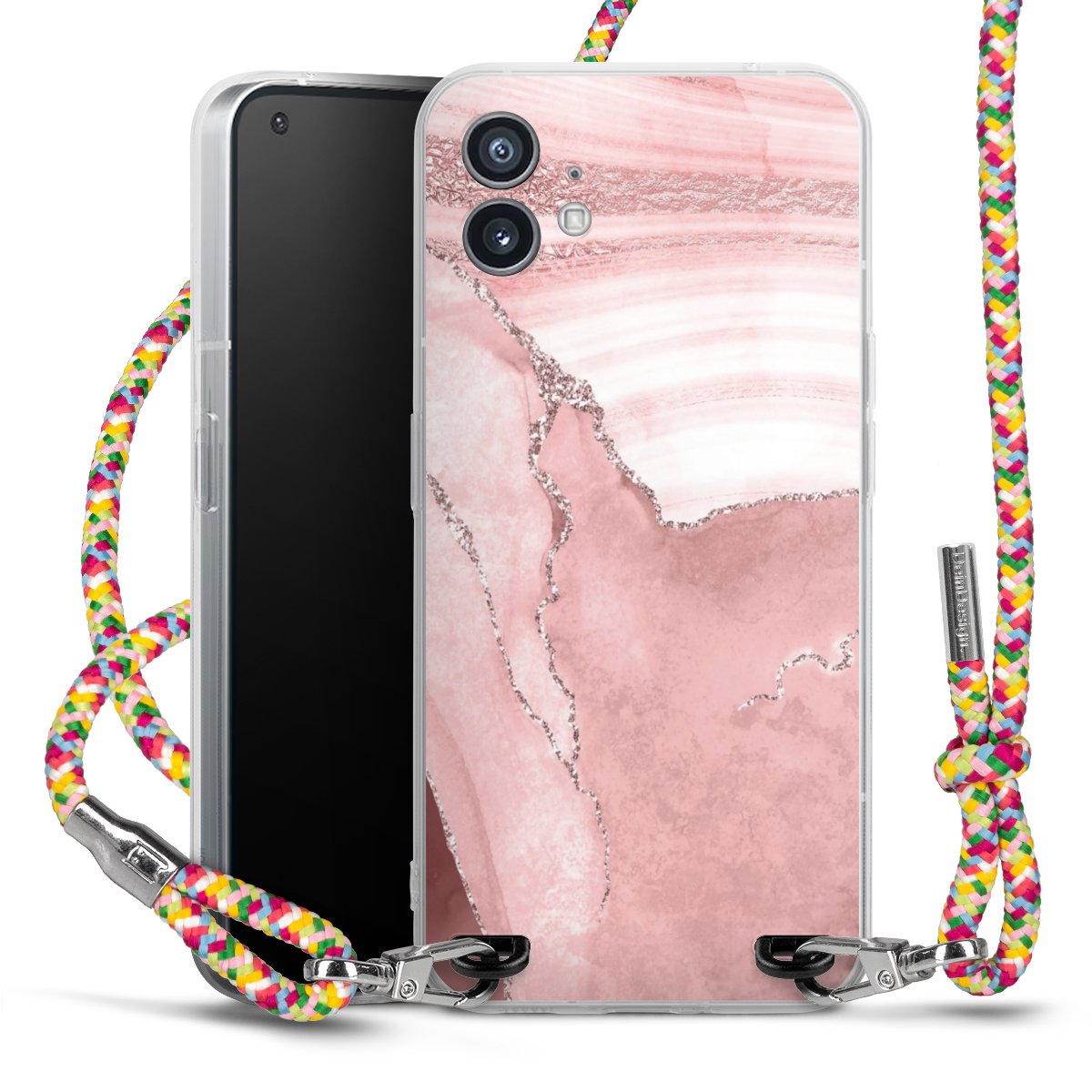 The flexible case is made from a highquality TPU material (thermoplastic Polyurethan). Thanks to its longlasting and break resistant characterisitcs, the case is flexible yet consistent in form and has a great grip and feel. The textile strap made from Polyester gives a chic yet casual accent allowing you to carry your phone like a bag or necklace - a practical gadget perfect for your next adventure. The textile strap is about 1.70 meters long and the length can easily be adjusted through the knots. Our Carry Case is available in Colourful, Mint-Camouflage, Very-Berry, Sahara-Sand and Sparkling-Neon. The ends of the textile strap are covered with metallic end caps to protect them against fraying.