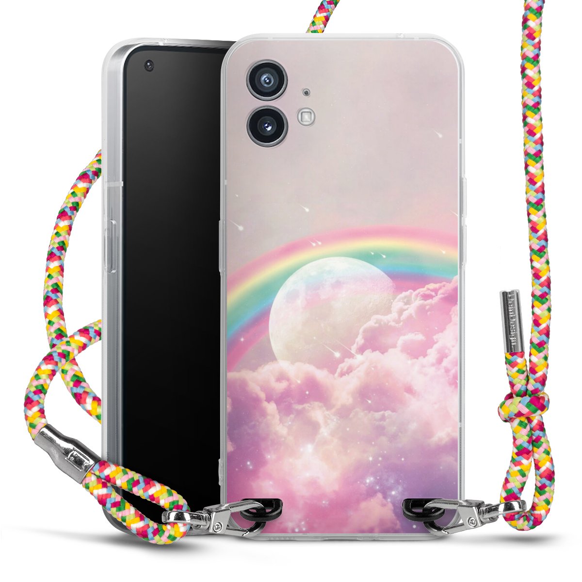 The flexible case is made from a highquality TPU material (thermoplastic Polyurethan). Thanks to its longlasting and break resistant characterisitcs, the case is flexible yet consistent in form and has a great grip and feel. The textile strap made from Polyester gives a chic yet casual accent allowing you to carry your phone like a bag or necklace - a practical gadget perfect for your next adventure. The textile strap is about 1.70 meters long and the length can easily be adjusted through the knots. Our Carry Case is available in Colourful, Mint-Camouflage, Very-Berry, Sahara-Sand and Sparkling-Neon. The ends of the textile strap are covered with metallic end caps to protect them against fraying.
