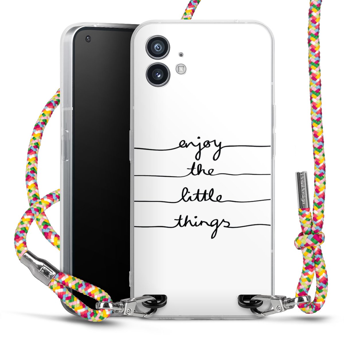 The flexible case is made from a highquality TPU material (thermoplastic Polyurethan). Thanks to its longlasting and break resistant characterisitcs, the case is flexible yet consistent in form and has a great grip and feel. The textile strap made from Polyester gives a chic yet casual accent allowing you to carry your phone like a bag or necklace - a practical gadget perfect for your next adventure. The textile strap is about 1.70 meters long and the length can easily be adjusted through the knots. Our Carry Case is available in Colourful, Mint-Camouflage, Very-Berry, Sahara-Sand and Sparkling-Neon. The ends of the textile strap are covered with metallic end caps to protect them against fraying.