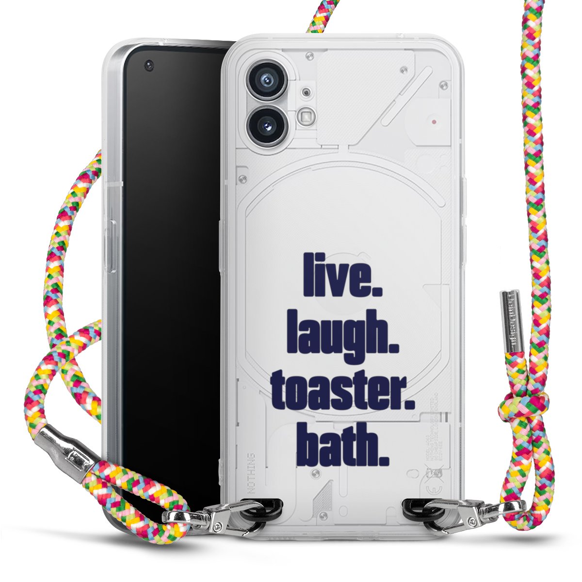 The flexible case is made from a highquality TPU material (thermoplastic Polyurethan). Thanks to its longlasting and break resistant characterisitcs, the case is flexible yet consistent in form and has a great grip and feel. The textile strap made from Polyester gives a chic yet casual accent allowing you to carry your phone like a bag or necklace - a practical gadget perfect for your next adventure. The textile strap is about 1.70 meters long and the length can easily be adjusted through the knots. Our Carry Case is available in Colourful, Mint-Camouflage, Very-Berry, Sahara-Sand and Sparkling-Neon. The ends of the textile strap are covered with metallic end caps to protect them against fraying.