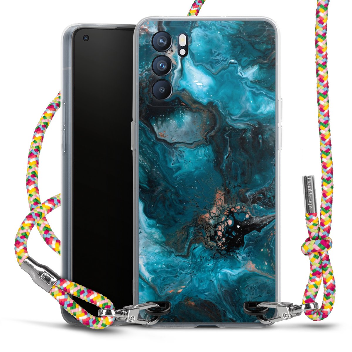 The flexible case is made from a highquality TPU material (thermoplastic Polyurethan). Thanks to its longlasting and break resistant characterisitcs, the case is flexible yet consistent in form and has a great grip and feel. The textile strap made from Polyester gives a chic yet casual accent allowing you to carry your phone like a bag or necklace - a practical gadget perfect for your next adventure. The textile strap is about 1.70 meters long and the length can easily be adjusted through the knots. Our Carry Case is available in Colourful, Mint-Camouflage, Very-Berry, Sahara-Sand and Sparkling-Neon. The ends of the textile strap are covered with metallic end caps to protect them against fraying.