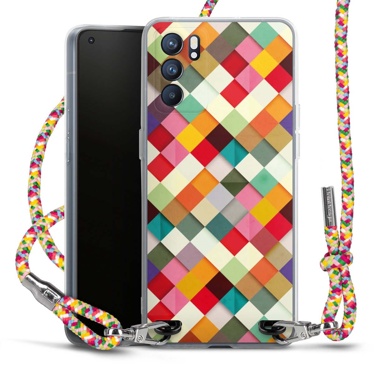 The flexible case is made from a highquality TPU material (thermoplastic Polyurethan). Thanks to its longlasting and break resistant characterisitcs, the case is flexible yet consistent in form and has a great grip and feel. The textile strap made from Polyester gives a chic yet casual accent allowing you to carry your phone like a bag or necklace - a practical gadget perfect for your next adventure. The textile strap is about 1.70 meters long and the length can easily be adjusted through the knots. Our Carry Case is available in Colourful, Mint-Camouflage, Very-Berry, Sahara-Sand and Sparkling-Neon. The ends of the textile strap are covered with metallic end caps to protect them against fraying.