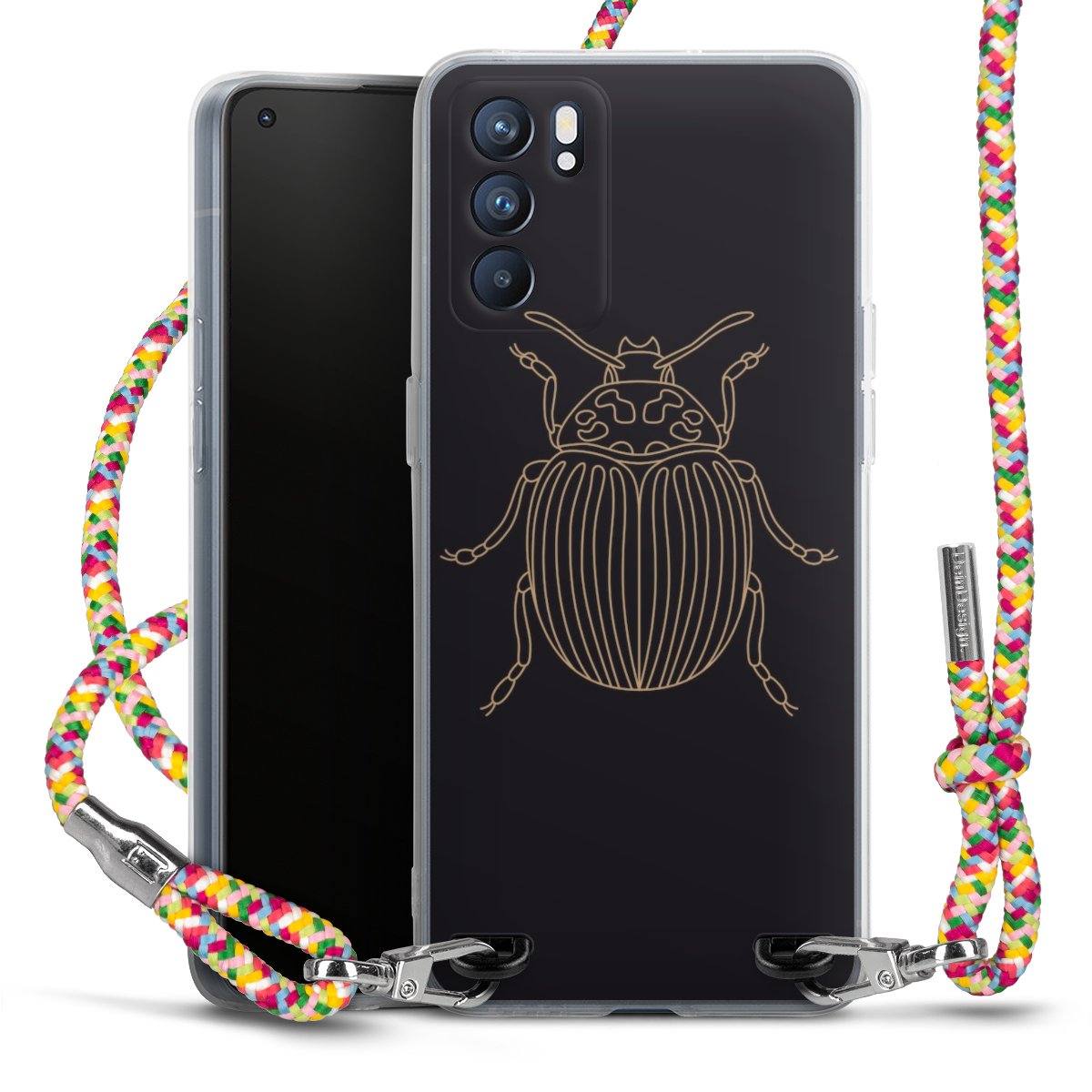 The flexible case is made from a highquality TPU material (thermoplastic Polyurethan). Thanks to its longlasting and break resistant characterisitcs, the case is flexible yet consistent in form and has a great grip and feel. The textile strap made from Polyester gives a chic yet casual accent allowing you to carry your phone like a bag or necklace - a practical gadget perfect for your next adventure. The textile strap is about 1.70 meters long and the length can easily be adjusted through the knots. Our Carry Case is available in Colourful, Mint-Camouflage, Very-Berry, Sahara-Sand and Sparkling-Neon. The ends of the textile strap are covered with metallic end caps to protect them against fraying.
